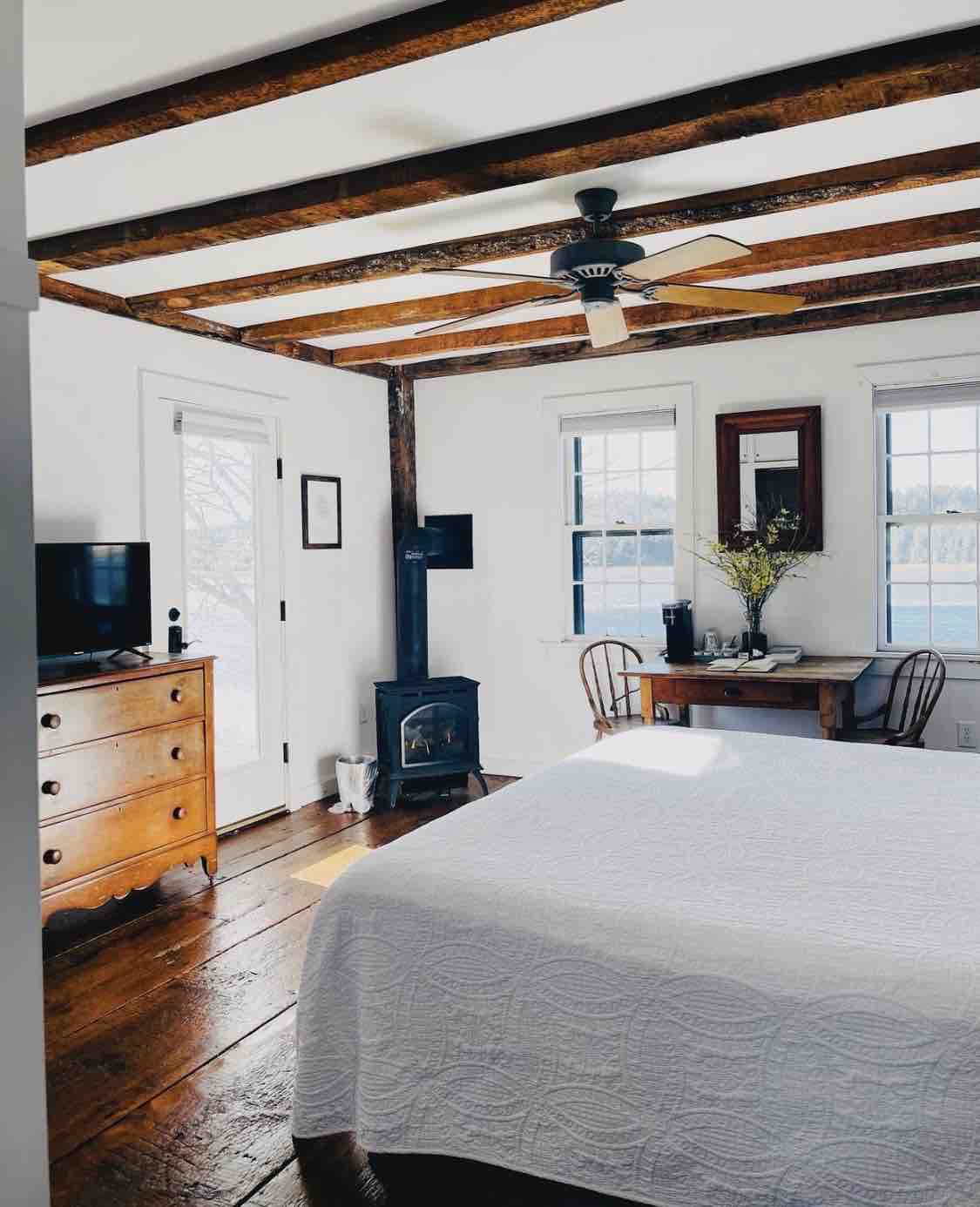 Dieses ruhige King-Zimmer mit eigenem Bad befindet sich im ersten Stock und bietet alles, was du für deine Reise benötigst! Die alten Balken an der Decke und die riesigen Kiefernholzdielen machen dieses Zimmer zu etwas ganz Besonderem, ganz zu schweigen vom Propankamin und dem atemberaubenden Blick auf den Machias River! Antike Dekoration mit einem Hauch von Maine im Zimmer hilft, die Atmosphäre des Bauernhauses aus den 1830er Jahren einzufangen. Das Zimmer ist mit Kaffee, Bettwäsche und Seifen sowie einem Tablett mit Leckereien für deine Ankunft ausgestattet! Ein Favorit der Gäste.
