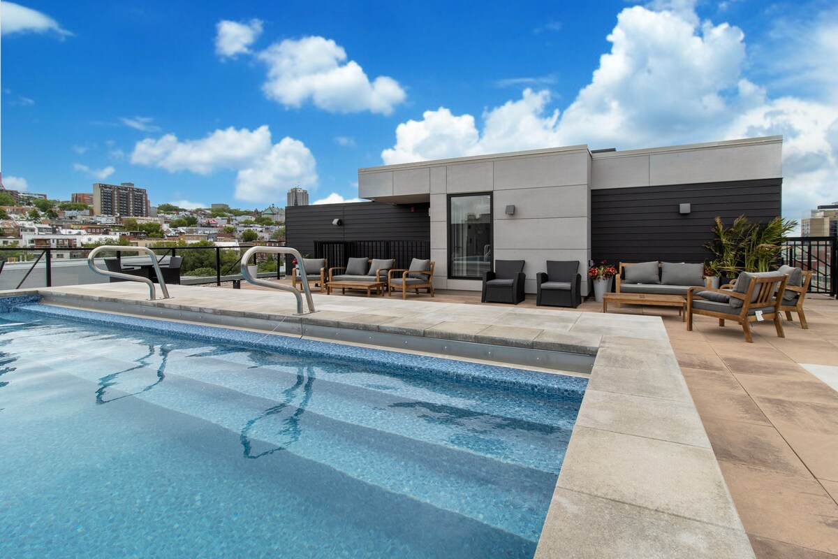 Genieße einen unvergesslichen Aufenthalt im Herzen des Viertels Saint-Roch in Quebec City in dieser modernen und luxuriösen Eigentumswohnung. Du wirst sowohl von den Gemeinschaftsbereichen als auch von der raffinierten Inneneinrichtung begeistert sein. ✧️ Parkplatz vorhanden ✧️ Dachterrasse mit Pool, Essbereich und Außenkamin ✧️ Grill auf der Dachterrasse ganzjährig verfügbar. ✧️ Voll ausgestattetes Fitnessstudio ✧️ Helle und komfortable Wohnung ✧️ High-Speed-WLAN und spezieller Arbeitsplatz ✧️ Nur 15 Gehminuten von der Altstadt von Quebec entfernt