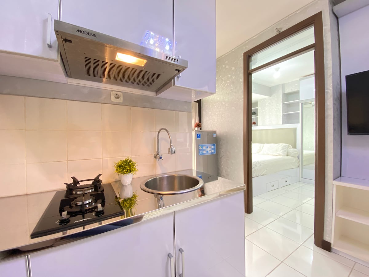 Stylist clean-design Studio-Apartment @ Grand Dhika City Jatiwarna, atemberaubende Aussicht, großer TV-Bildschirm, Küche, Warmwasserbereiter, Poolzugang.