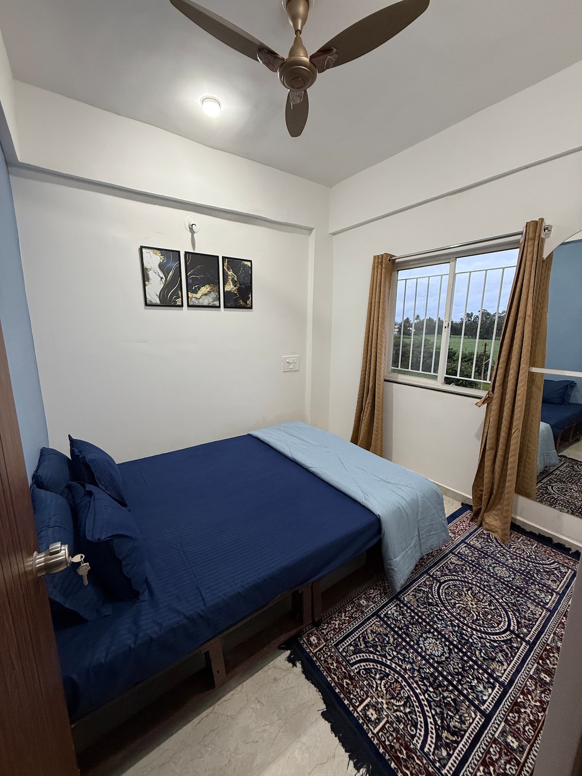 Check plant image in living room. Rates are for 2 people. Unmarried couples are not allowed. A peaceful stay in the Marcela Village, major temples in surrounding. The place is a completely fully furnished placed with all amenities such as 43" smart tv, fully automatic washing machine, refrigerator, kitchen setup, water purifier, bedroom with air conditioner, high speed internet and lush green trees. No heavy blankets.