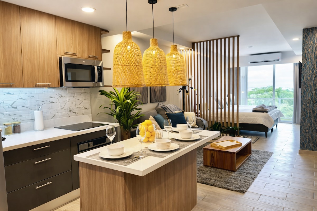 Disfruta de una experiencia con estilo en este alojamiento céntrico. Este apartamento estudio está diseñado con un toque moderno, elegante y sofisticado, cuenta con estacionamiento gratuito p-220 hay una plaza con tiendas, farmacias, supermercados y restaurantes. además, hay un boliche cerca del apartamento. El edificio cuenta con sala de reuniones, mini cine privado, Gimnasio, terraza con vista a la piscina y Seguridad las 24 horas.
