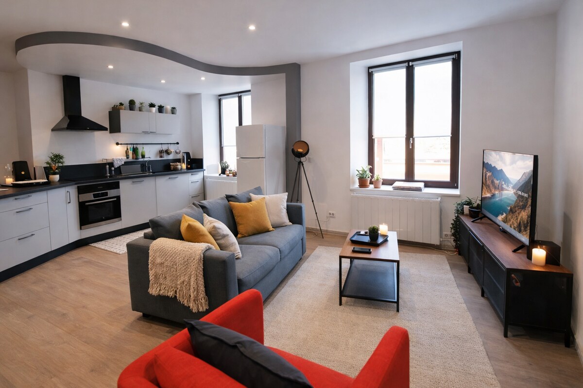 Diese helle 2-Zimmer-Wohnung befindet sich im 1. Stock eines kleinen Wohnhauses und verbindet Komfort und Stil. Jedes Schlafzimmer verfügt über einen Schreibtisch, der sich perfekt für komfortables Arbeiten eignet. Highspeed-Glasfaser, ein 55-Zoll-Fernseher mit Netflix und ein Marshall-Bluetooth-Lautsprecher schaffen eine entspannte Atmosphäre. Die moderne, voll ausgestattete Küche und die geschmackvolle Einrichtung bieten eine gemütliche Umgebung für Geschäftsreisen, Familienaufenthalte oder Kurzurlaube mit Freunden in Belfort.