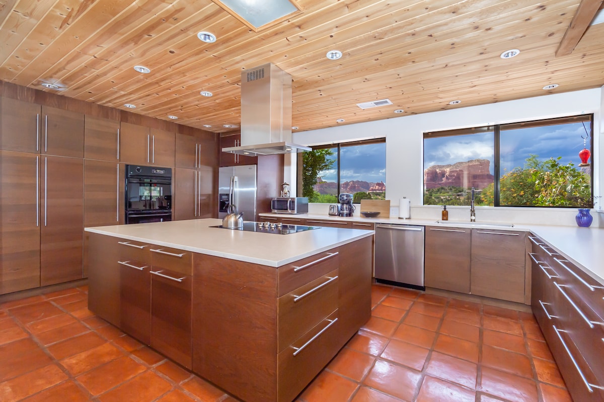 **NEUER RUNDENPOOL 2025!** Das Haupthaus von Chapel Vista wurde von The Design Group entworfen, um sich auf die Kapelle des Heiligen Kreuzes zu konzentrieren und einen Blick aus mehreren Richtungen und von jedem Zimmer aus zu bieten. EV-Ladegerät. Kurzer Fußweg zur Kapelle & zum Mystic, Chapel, Broken Arrow, White Line & Hog Heaven Trailheads. Großes Grundstück mit atemberaubenden Gärten und Whirlpool. Ruhige Nachbarschaft. Sternenbeobachtung bei Nacht von der Unterkunft aus. Solaranlage. High-End-Badezimmer sind mit Toto Washlets/Bidets & Victoria Albert Waschbecken.