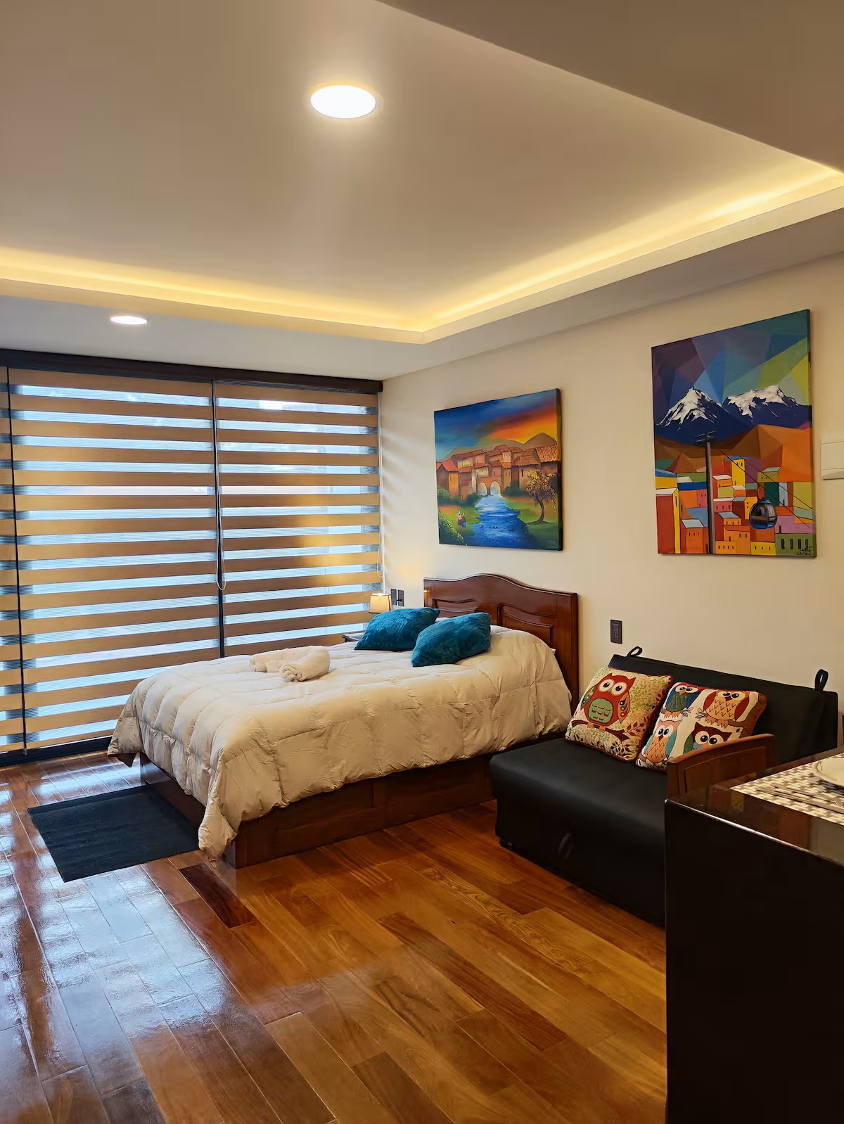 Entdecke unsere neue Wohnung in Obrajes, ideal gelegen, nur 10 Minuten von der Innenstadt und 5 Minuten vom pulsierenden San Miguel entfernt. In der Nähe von Supermärkten, Apotheken, Geldautomaten und vielem mehr. Genieße eine sonnenverwöhnte, erhöhte Wohnung mit einem flexiblen Schlafzimmer mit entweder einem Kingsize-Bett oder zwei Einzelbetten sowie einem Schlafsofa und einem großen Kissen, das bequem Platz für bis zu 4 Gäste bietet. Ideal für Geschäftsreisen oder Erkundungen in der Stadt. Wir freuen uns darauf, Sie bei uns zu begrüßen.
