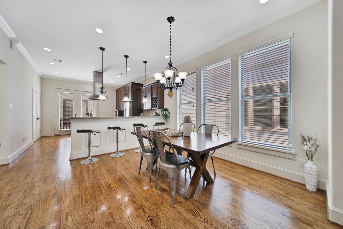Erlebe Houston auf einem höheren Niveau in unserem stilvollen Airbnb im Herzen von Uptown Houston. Sobald du durch die Tür kommst, wirst du von dem modernen Design und viel natürlichem Licht mit unseren großen Fenstern begrüßt. Die geräumige Aufteilung des Hauses mit 3 Schlafzimmern, die auch familienfreundlich sind, bietet einen ausgezeichneten Ort zum Schlafen nach einem langen Tag. Die Küche ist mit hochwertigen Geräten ausgestattet, um eine Mahlzeit jeglicher Art zuzubereiten. Außerdem gibt es einen Außenbereich zum Entspannen. Buche deinen Aufenthalt