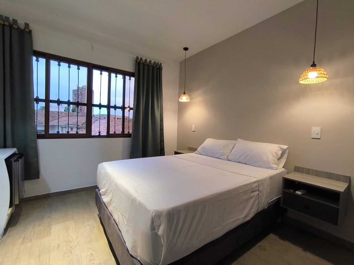 Habitación privada cómoda y bien ubicada en el corazón histórico de Cali, ideal para viajeros que desean explorar caminando lo mejor de la ciudad. Cuenta con baño privado, ventilador, TV, escritorio, WiFi y cocineta equipada con microondas, cafetera y nevera. A media cuadra del Boulevard del Río, 4 museos alrededor, la Calle del Sabor, restaurantes, bares y el Gato de Tejada. Ubicación estratégica en zona turística, cultural y gastronómica. Cerca a San Antonio, Granada y Peñon.