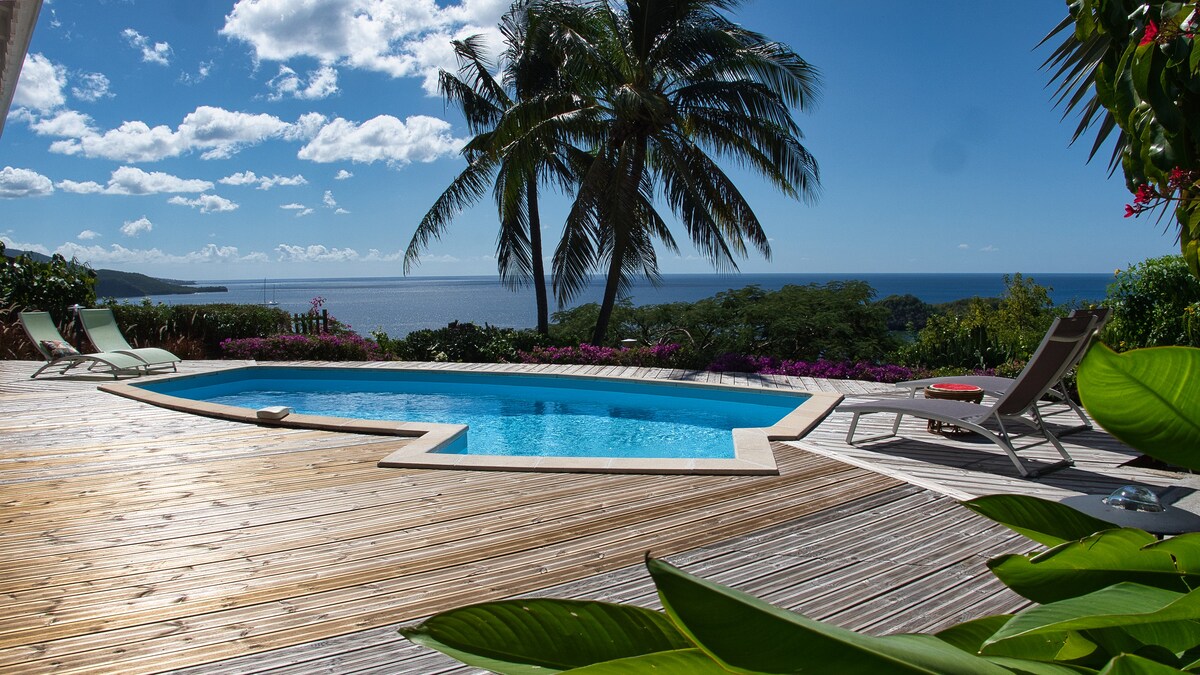 Venez profiter de la vue vue imprenable sur la mer des Caraïbes Vous pourrez vous rafraichir dans la piscine après vos activités de la journée: plongée, randonnées, plage... Un choix de restaurant vous attend dans le bourg ou sur les plages mais vous pourrez préparer vos repas dans la vaste cuisine équipée et diner à votre convenance dedans ou dehors Un repos paisible vous attend dans 3 chambres climatisées(2 avec vue mer)chacune équipée de leur salle de douche