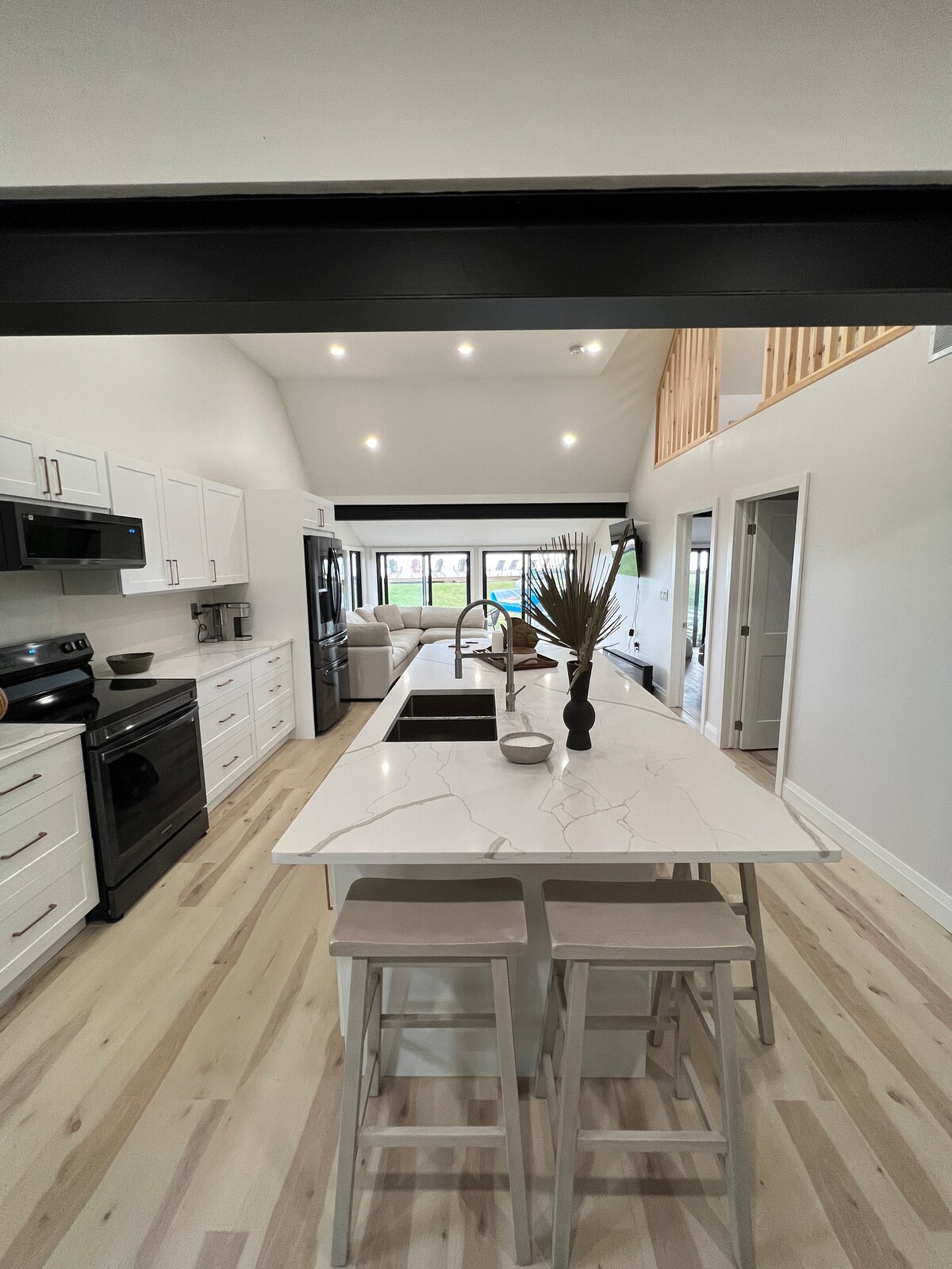 Waterfront Modern Executive Cottage with lots of natural light and stunning views. This cottage is a breath of fresh air and provides all of the comforts and conveniences that you need in a luxurious relaxing getaway . The cottage boasts a unique layout that sleeps 4 with a bright fully stocked kitchen and dinette, master bedroom, an eclectic second bedroom, barn doors, Smart TV and plenty of closet space, gas fireplace, swimming pool and giant waterfront backyard with lake access to swim.
