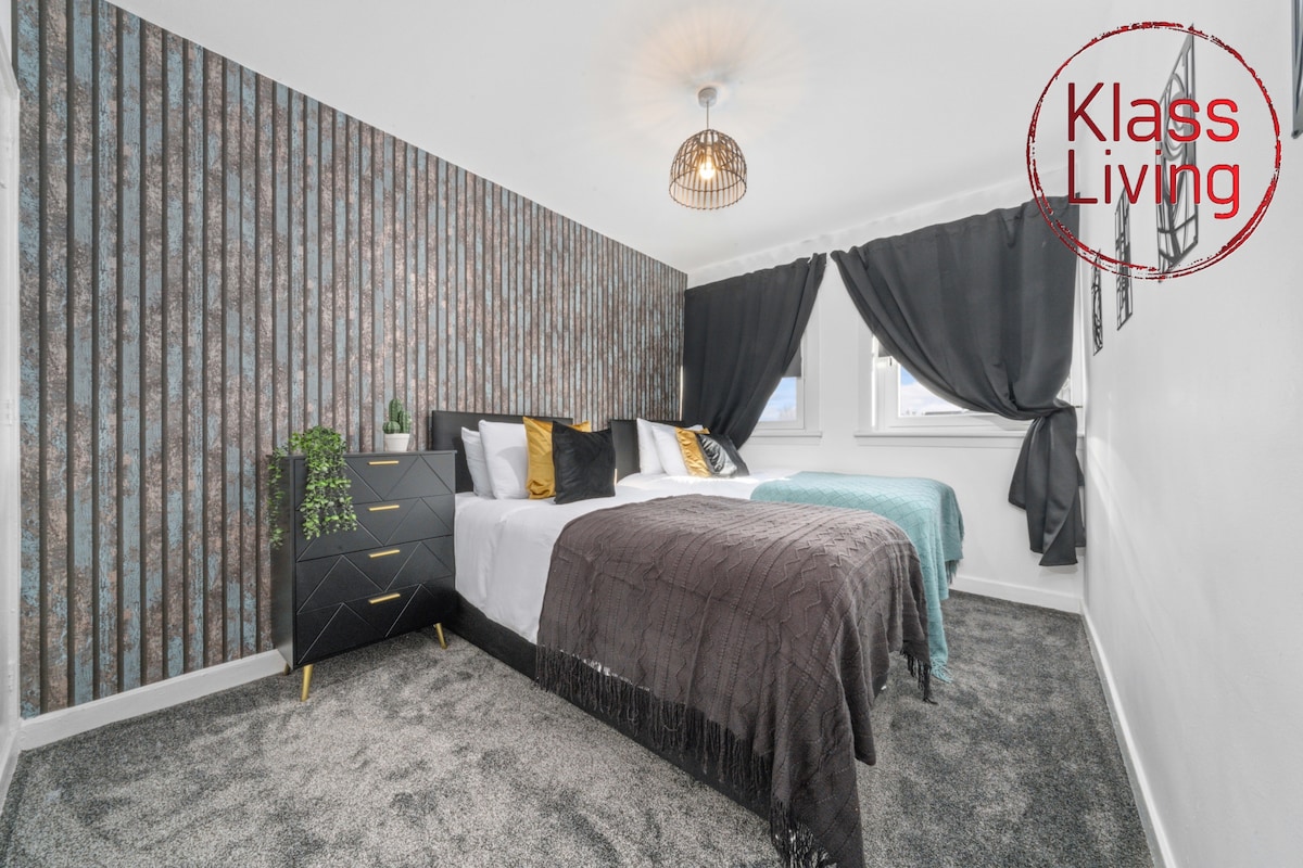 2 bedroom Beautiful Apartment - only a short drive from Glasgow City Centre. Each bedroom has a workspace desk, comfy bed with linen & towels, and mirror wardrobe for you to get ready to explore the area. Living area with dining table, WI-FI, and TV to enjoy favourite programmes or You tube. Kitchen is equipped with cooking essentials such as pots/pans, coffee machine, toaster, microwave & gas cooker. 🗝 2 Bedroom Apartment - up to 4 guests 🗝 2x Double Beds 🗝 Professionally Cleaned