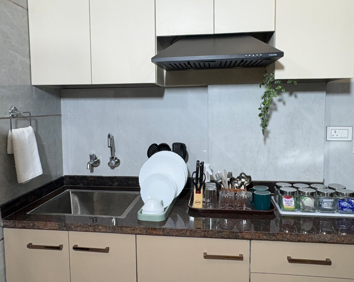Welcome to our brand-new premium 1-BHK apartment in a central, prime, well-connected location with easy access to business hubs, hospitals, offices, and daily conveniences. The bedroom features a queen-size bed with a supportive orthopedic mattress for restful sleep. A calm living space with high-speed Wi-Fi, a Smart TV for work and relaxation. The bathroom is spotless and hygienic, stocked with essential toiletries. A fully equipped kitchen with quality appliances allows convenient meal.