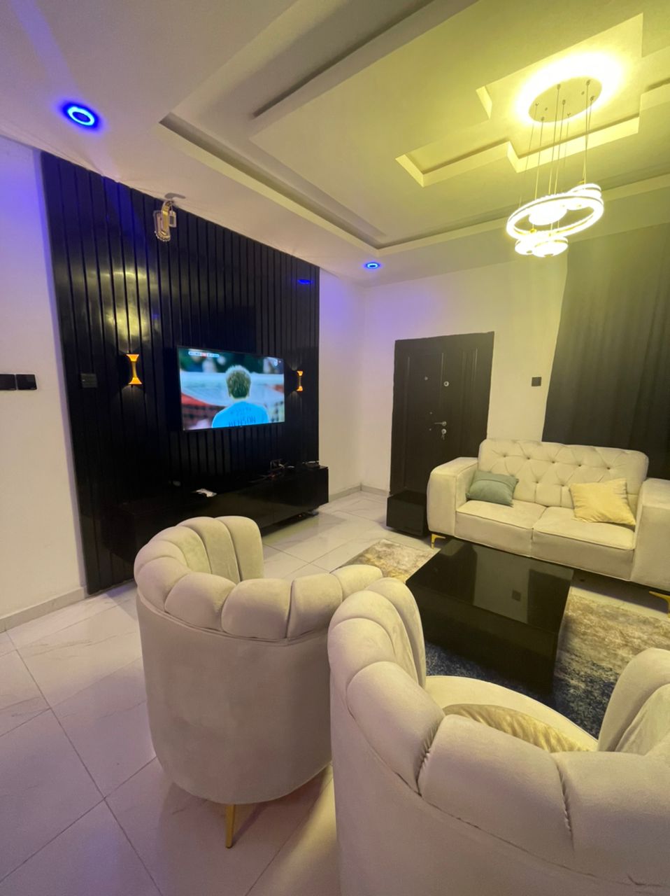 All Day uninterrupted power supply fully serviced round the clock house keeping fitted and functional kitchen smart tv free WiFi free and secure parking armed security guard government reserved area only 2 mins from all amenities including shopping cinema bar and lounges.