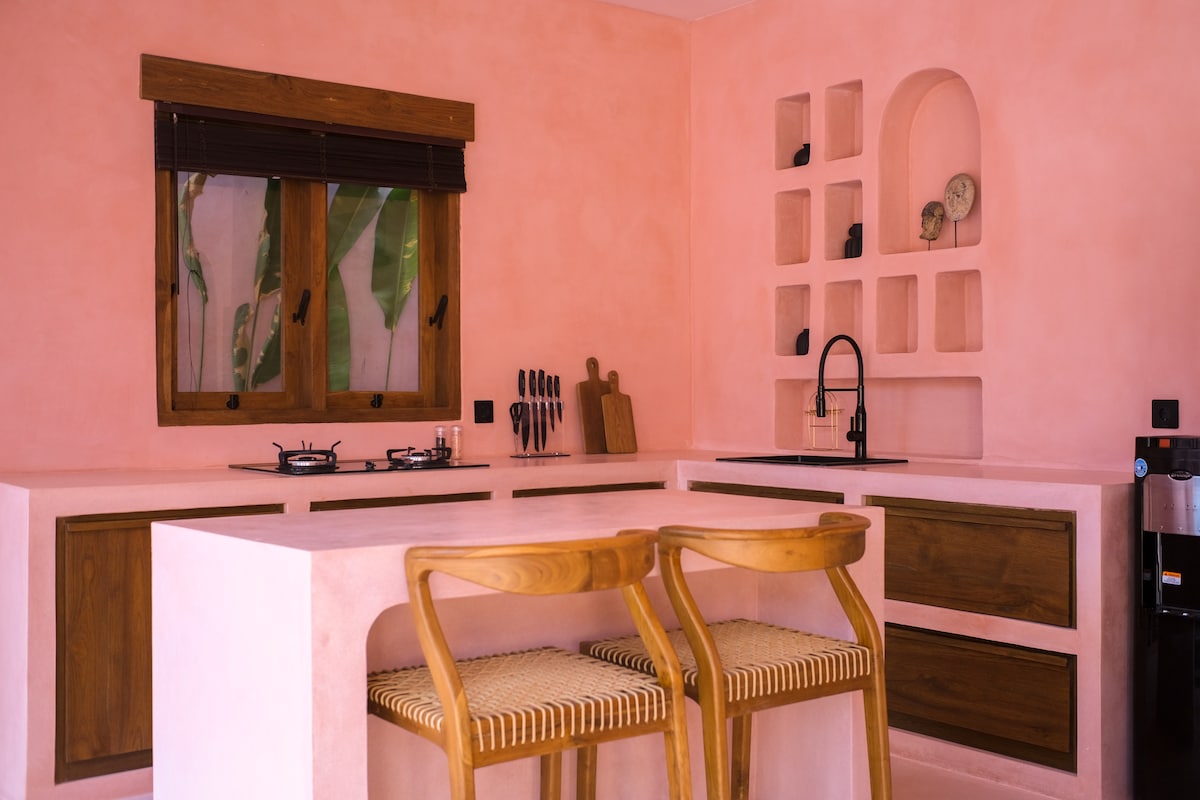 Escape to Villa Ella June Canggu, a captivating Moroccan-inspired retreat in the heart of Canggu. This single-story villa harmonizes Moroccan and Mediterranean influences, offering a unique and enchanting ambiance. Immerse yourself in the refreshing swimming pool, unwind in the sunken living area, and experience the one-of-a-kind features. With its distinctive pink color, outdoor shower, and rice field views, Villa Ella June provides an unforgettable escape for an unforgettable stay.