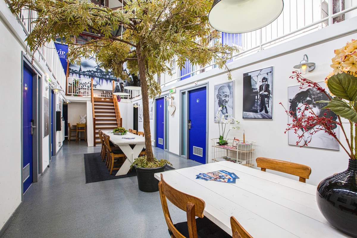 Vanuit deze charmante accommodatie ben je zo bij populaire winkels en restaurants. En de kaasmarkt. We zitten aan de rand van het centrum en zijn op loopafstand ( 15 min) van het centraal station te bereiken. De 4, 6 en 8 persoons kamer hebben geen raam. In de kamer is een douche en toilet aanwezig. Kluisjes zijn beschikbaar in de gemeenschappelijke ruimte; neem je eigen hangslot mee of huur er een voor €5.