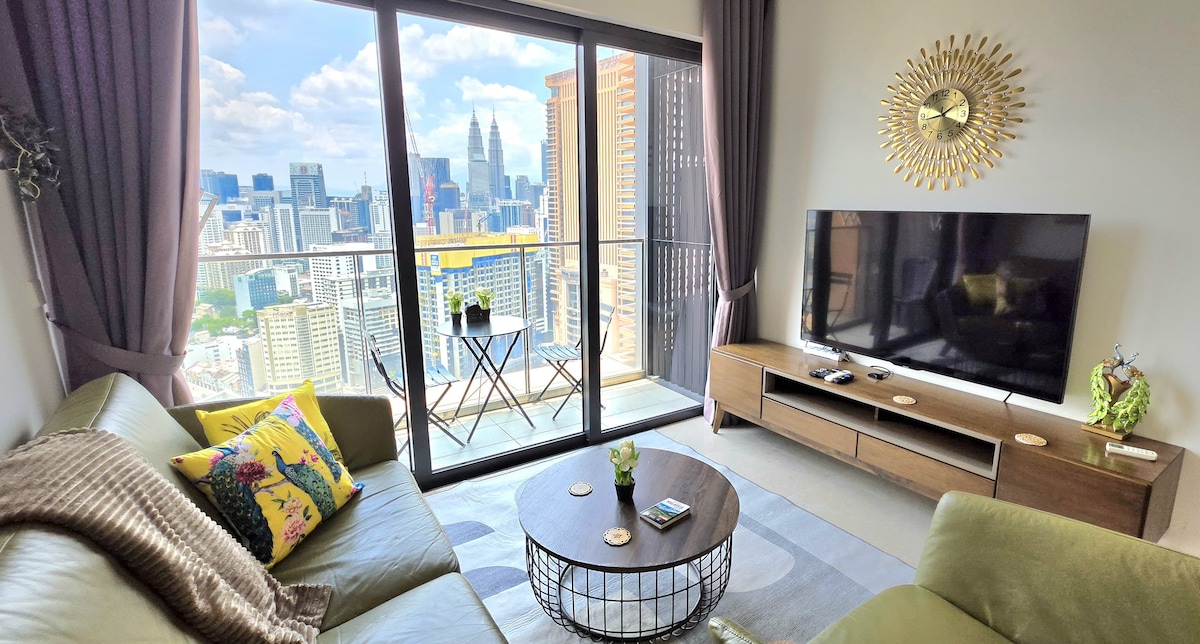 Dieses Apartment mit 1 Schlafzimmer verfügt über einen atemberaubenden Blick auf die Skyline von KL. Sie verfügt über ein 3-Sitzer-Sofa im Wohnzimmer, einen Esstisch, eine Küche, einen Schreibtisch und einen großen Balkon mit Blick auf den KL Tower und die Petronas Twin Towers. Sie verfügt über einen 55-Zoll-Fernseher, Highspeed-WLAN und ein Queensize-Bett, in das du bequem hineinpassen kannst. *Die andere Einheit dieser Dual-Key-Wohnung ist ein kompaktes Studio mit Queensize-Bett, Speisekammer, Waschraum und Bad. Es kann in Freunde passen, die mit dir reisen, mit Privatsphäre. Du kannst gerne nach weiteren Einzelheiten fragen!