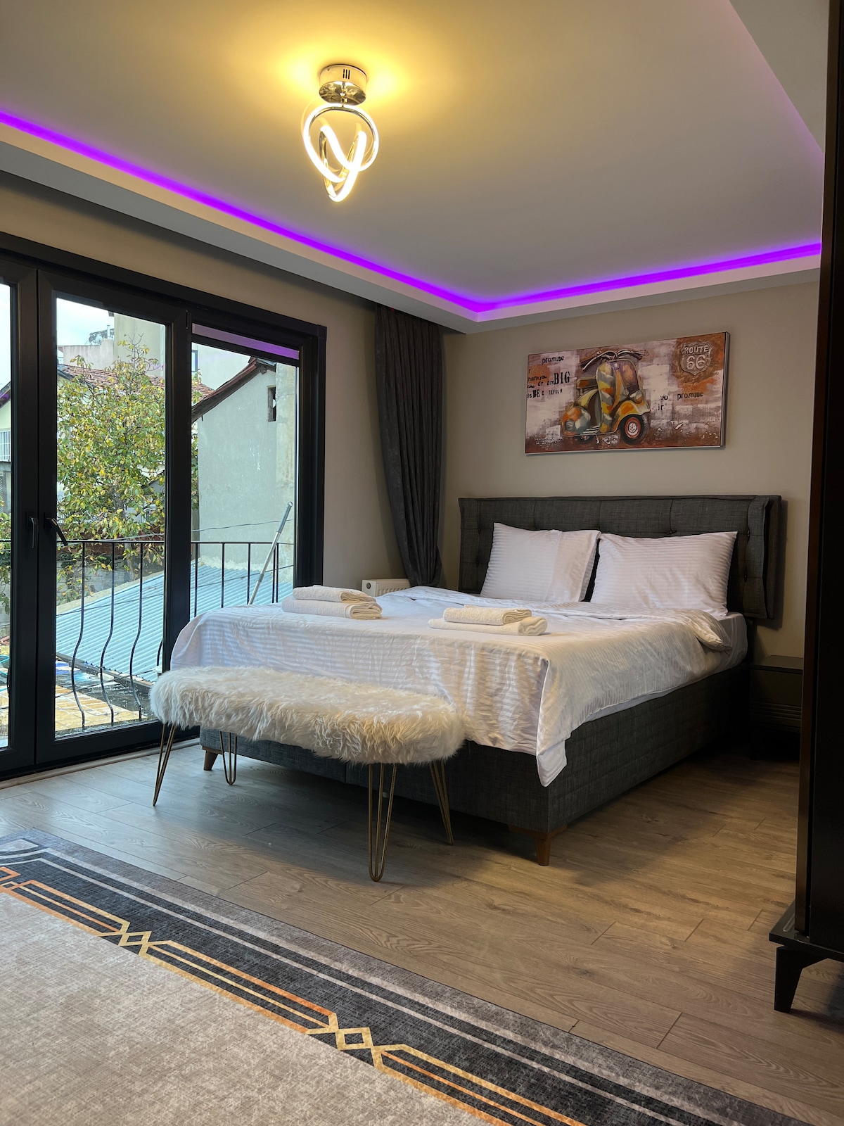 Our room is luxurious, modern and carefully designed. Located in our hotel, this room has a large double bed, a 32-inch smart television and a private bathroom. Our room a mini fridge and small kitchen supplies. Our room is on the 2nd floor. There is a 24/7 camera and security system. The exterior door of the building is specially coded and protected. Our room is designed to accommodate 2 people.
