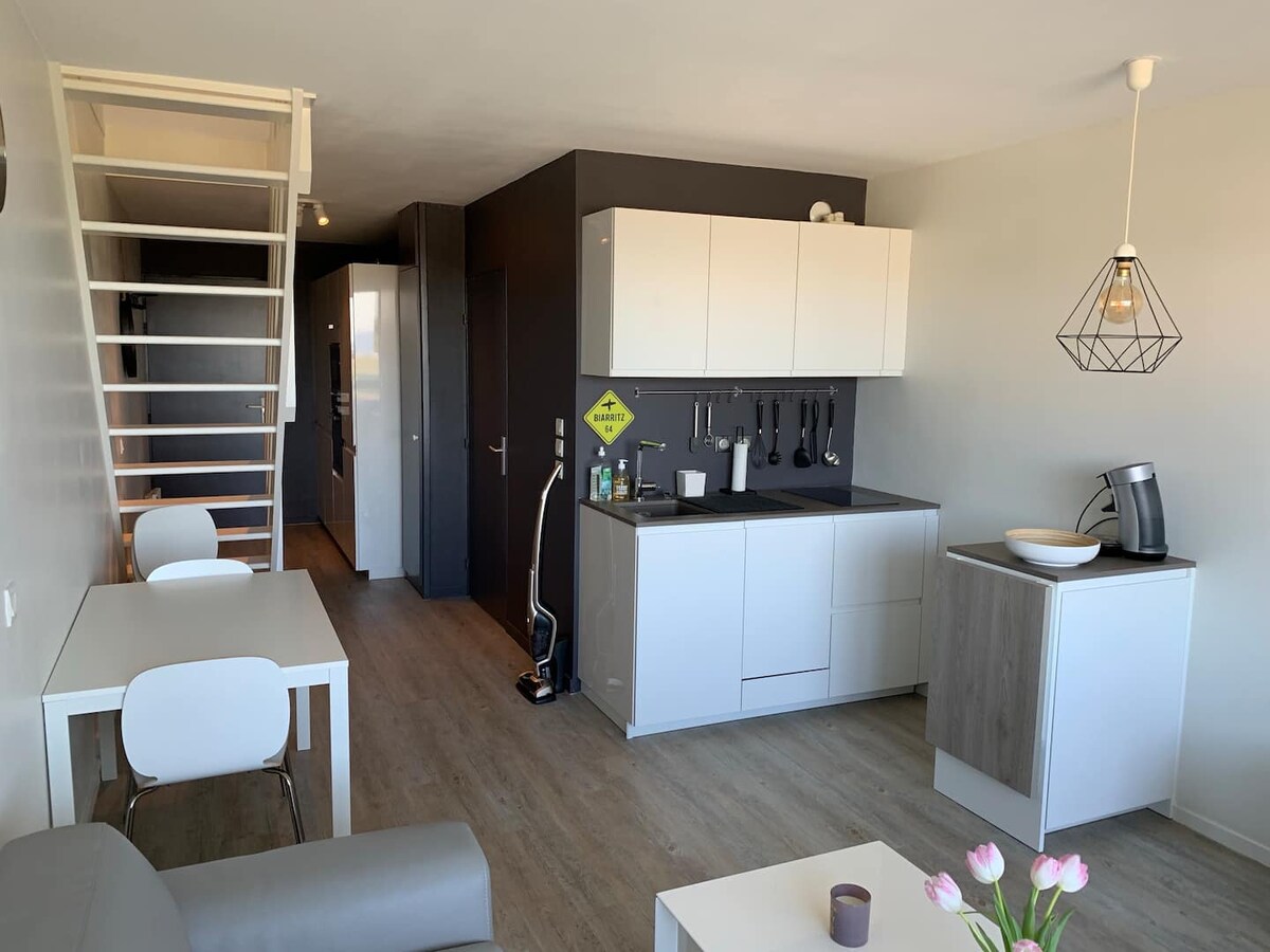 Wunderschöne Wohnung von 27 m2 im zehnten Stock der berühmten Residenz VICTORIA SURF, Panoramablick auf die Stadt, von der Terrasse, um den Sonnenaufgang und die Mahlzeiten in vollen Zügen zu genießen, direkter Zugang zum großen Strand von BIARRITZ sowie zum Pool der Residenz (von Juni bis September). Das Studio besteht aus einem Bett von 160 x 200 cm, Küchenbereich, Bad, einer separaten Toilette, Abstellraum sowie einem eigenen Arbeitsbereich. Die Reinigung sowie die Bettwäsche sind im Preis inbegriffen.