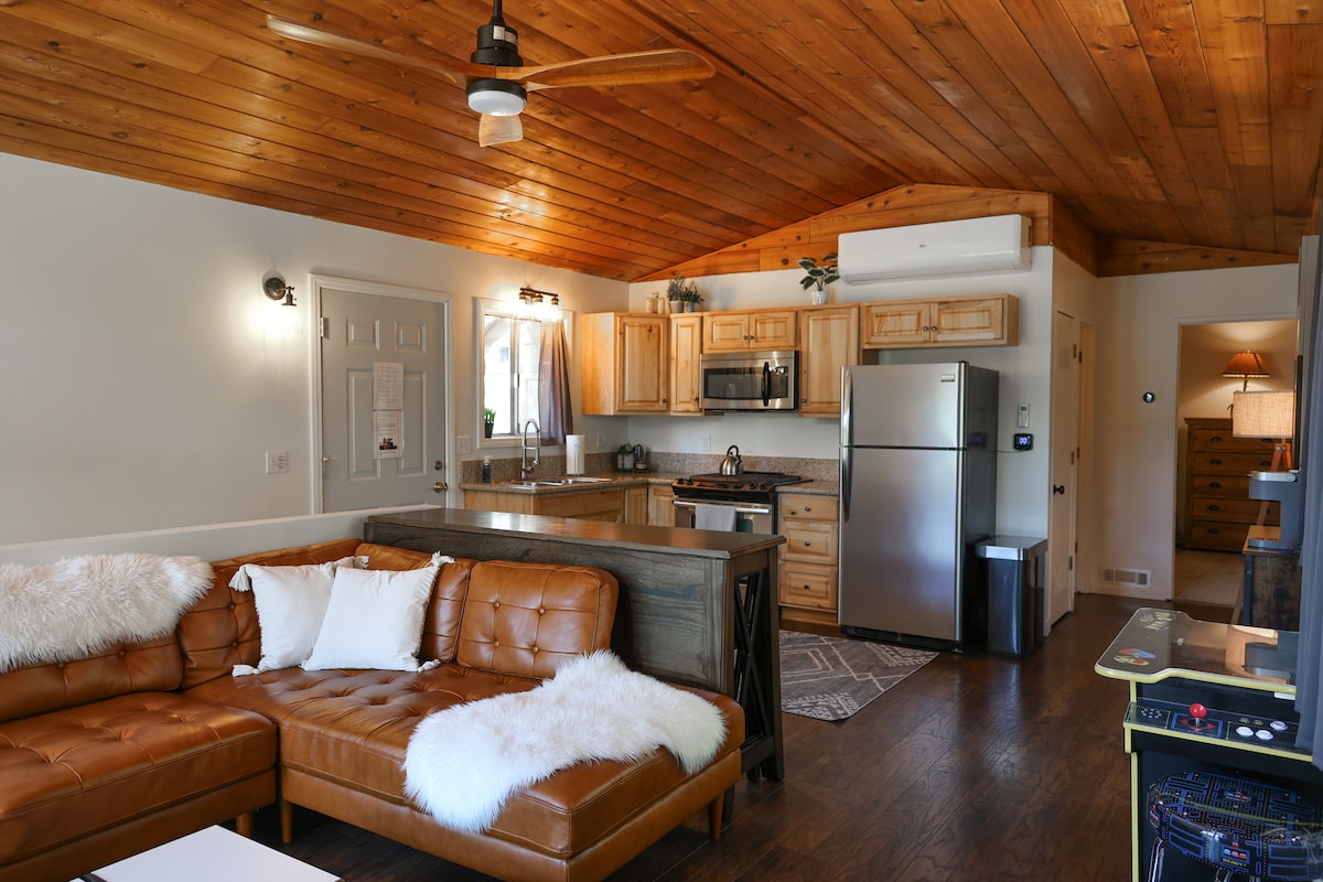 Die Casa Paloma liegt in den Bergen von Big Bear, nur einen kurzen Spaziergang vom San Bernardino National Forest, dem Big Bear Mountain Resort, dem Golfplatz und dem Zoo entfernt! Die Hauptattraktion der Hütte ist eine große Terrasse mit einem 10-Personen-Whirlpool aus Zedernholz sowie einem Sitzbereich und einer Feuerstelle. Diese von den 70ern inspirierte Hütte verfügt über 4 Schlafzimmer mit Vintage-Flair. Beobachte den Sonnenuntergang über dem Big Bear Lake auf der oberen Terrasse oder mach es dir nach einem langen Wander- oder Skitag gemütlich neben dem Kamin.