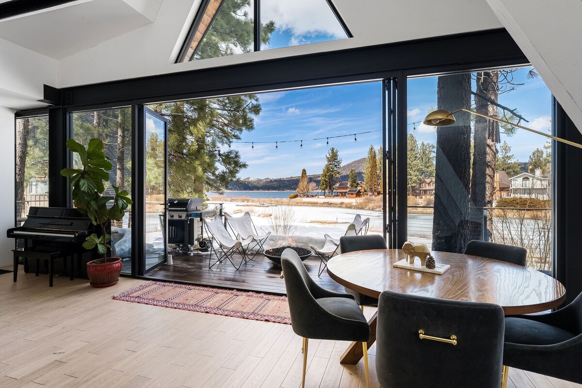. Walking distance to the Big Bear Mountain Resort . Stunning sunsets from the deck . Pets welcome . A-Frame + Open Concept Lounge/Dining/Kitchen . Fully Equipped Kitchen w/high end Smeg + Hallman Appliances . Large Furnished Main Deck w/ Stunning Lake +Forest Views . Movie Room w/high-resolution projector . BBQ/Grill . Hiking Trails right outside our doorstep . High-speed Wi-Fi + Workspace . Central Heating + Fireplaces . Hot Tub on a covered deck offering privacy + scenic views year-round!
