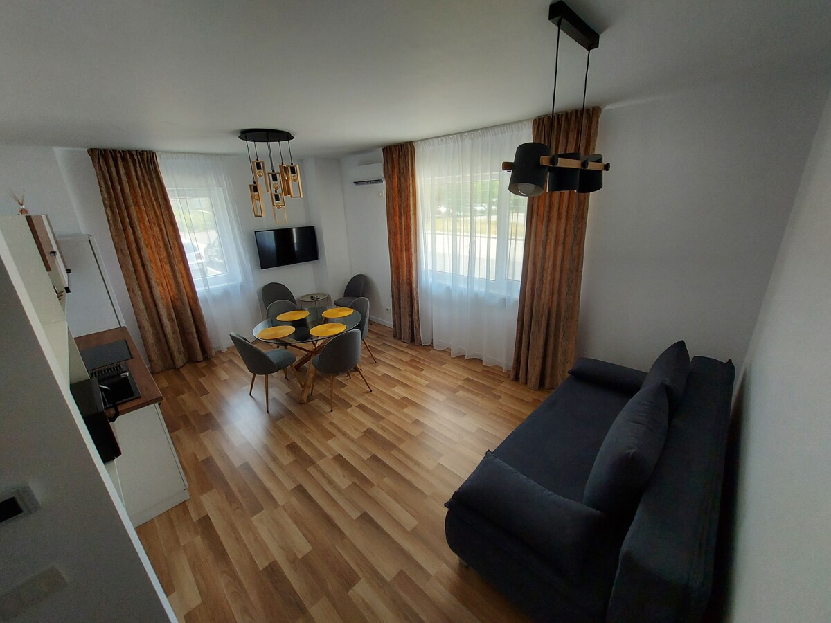 Enjoy a modern stay on Oneștilor Street, near Lotus Retail Park. The apartment offers a quiet bedroom, living room with sofa bed and a spa-like bathroom with walk-in shower and integrated bench. The piece de resistance is the balcony with a sunset view. - Excellent location (shopping & restaurants within walking distance) - Shower with a tiled bench (total relaxation) - Spacious balcony with a sunset view - Parking - Capacity 4 people - Self Check-in & fast Wi-Fi.