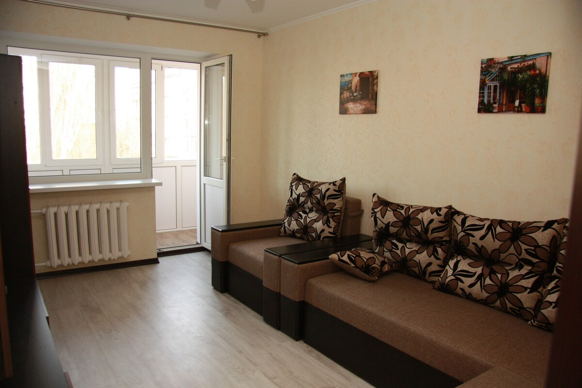 Gemütliche Wohnung mit Balkon und modernen Geräten. Wir bieten eine stilvolle und komfortable Wohnung für einen komfortablen Aufenthalt. Sie werden einen geräumigen Balkon mit Aussicht finden, auf dem Sie die frische Luft genießen können. Im Hof gibt es einen Spielplatz, der besonders praktisch für Gäste mit Kindern ist. Die Küche ist mit einem Kühlschrank, einer Mikrowelle und allem ausgestattet, was du zum Kochen benötigst. WLAN, großer 50-Zoll-Fernseher mit Smart-TV. Die Wohnung verfügt über eine Dusche, ein Bad, eine Toilette. Großes Hochbett. Der Supermarkt ist 10 Minuten entfernt.