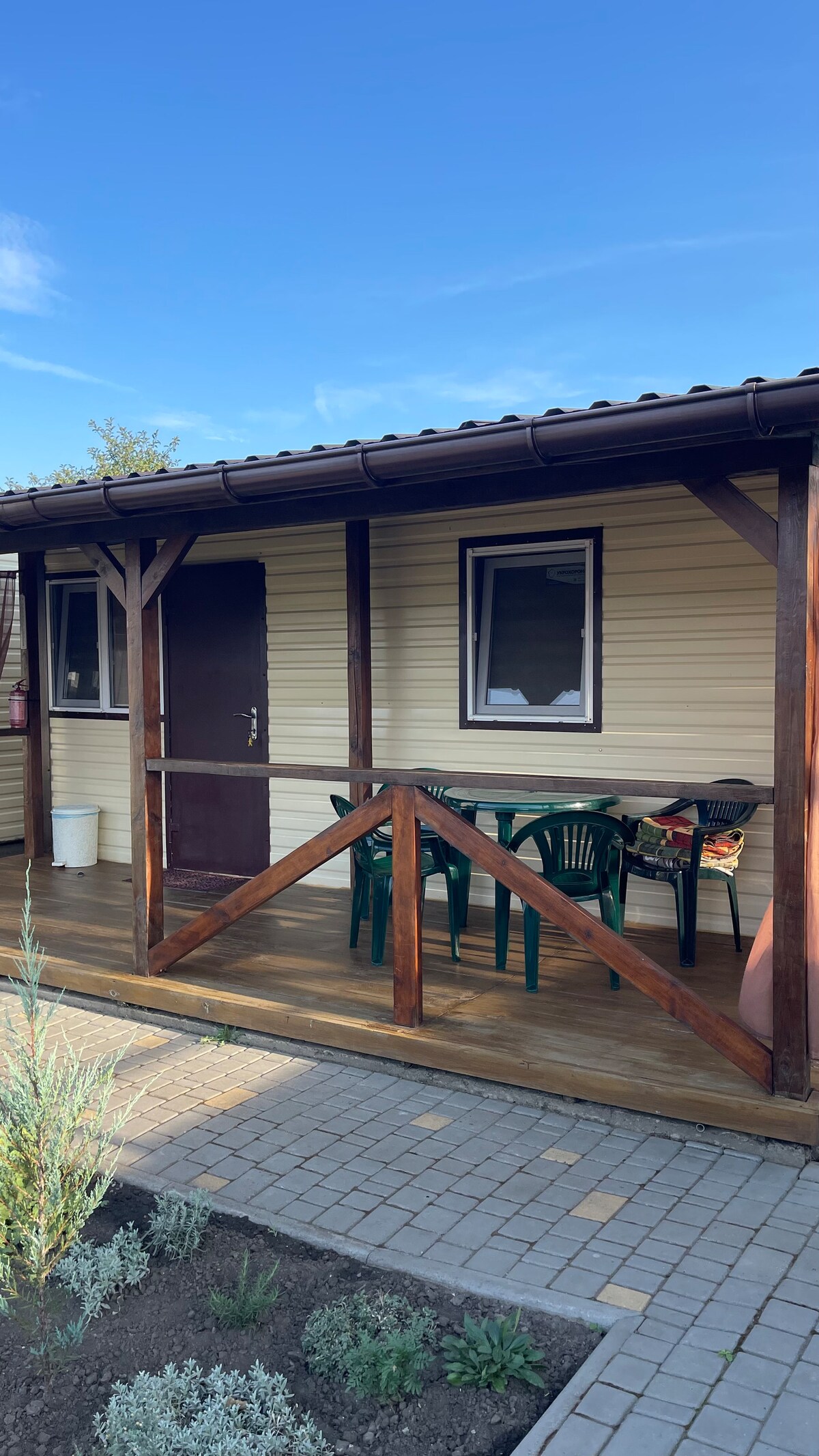 Gemütliche Blockhütten im mediterranen Stil, mit einem stilvollen Interieur und einer einmaligen Atmosphäre. Die Hütten befinden sich in den Vororten von Tschernomorsk (2,5 km), nur 7 Gehminuten vom Meer entfernt (700 m). Jedes Haus hat alles, was du für einen langen und kurzen Aufenthalt als Familie oder Gruppe benötigst. Das Haus verfügt über eine Küche zur Selbstverpflegung, eine Terrasse mit Möbeln und einen Grill. Ruhige Lage für einen ruhigen und schönen Urlaub am Meer.