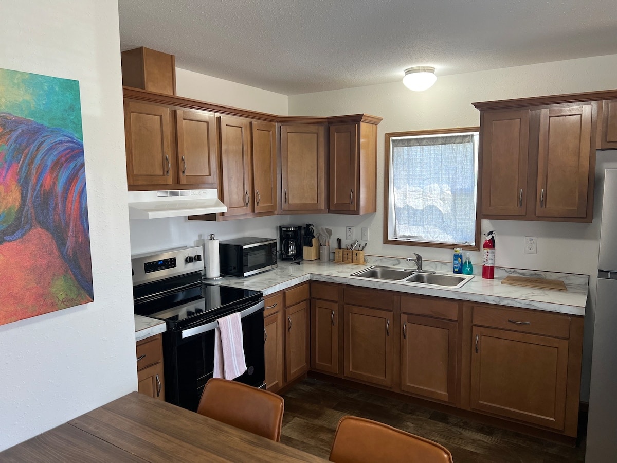 Dieses moderne, kunstvolle Gästehaus ist Medoras stilvollste Unterkunft – nur wenige Minuten vom Maah Daah Hey Trail, dem Bully Pulpit Golf Course und dem Theodore Roosevelt National Park entfernt. Mit zwei ruhigen Queen-Schlafzimmern, einer voll ausgestatteten Küche, geräumigen Wohnbereichen und einer unteren Ebene mit vier Twin-XL-Murphy-Betten und einem Tischtennis-Tisch ist es für ein komfortables Wohnen konzipiert. Durchdachte Annehmlichkeiten für Familien und ein atemberaubender Blick auf die Badlands machen es zu einem perfekten Ort, um sich zu entspannen und neue Energie zu tanken.