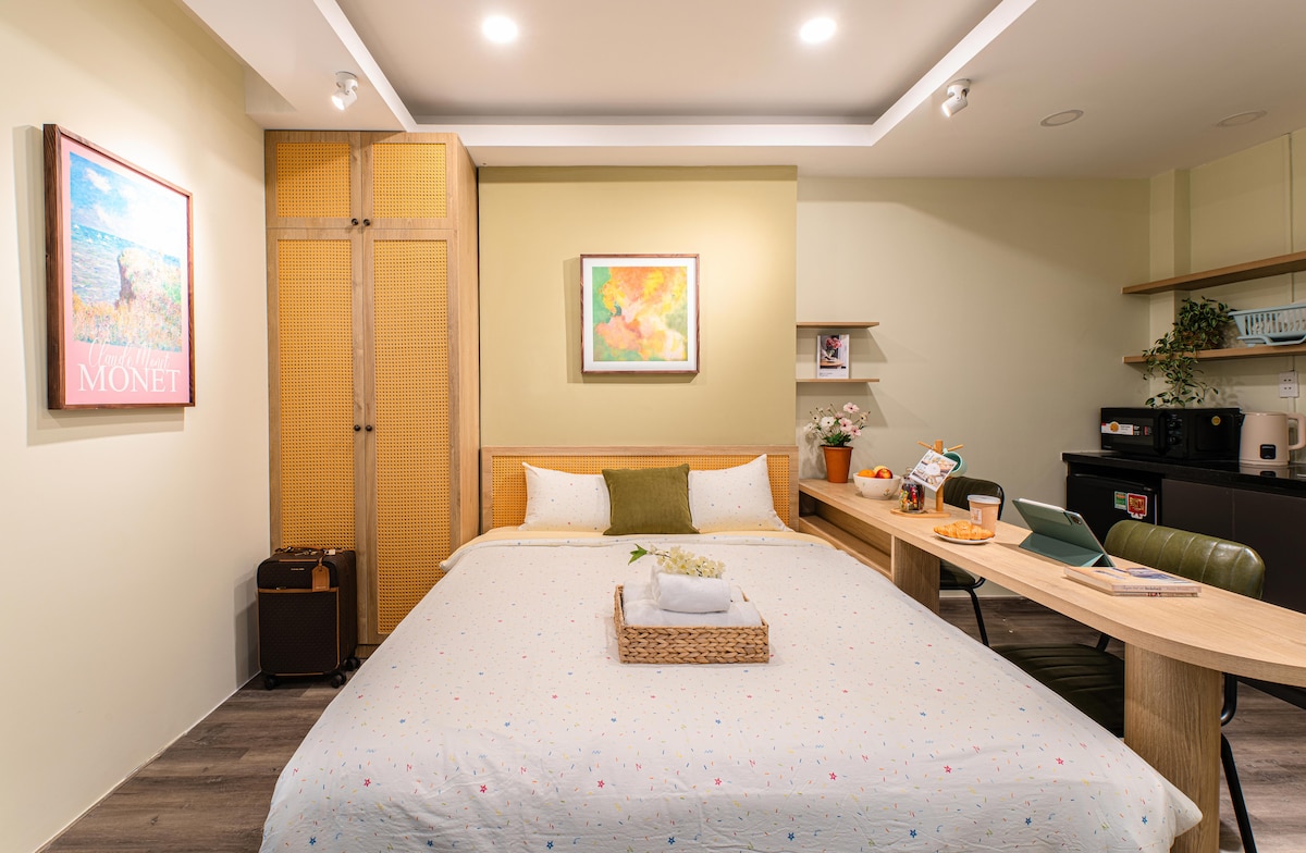 Eine gemütliche, familiengeführte Privatunterkunft, perfekt für ein abgelegenes und dennoch lebendiges Erlebnis. Es befindet sich in einer ruhigen Gasse, nur einen kurzen Spaziergang vom Saigon Riverside, Bình An Wasserbus, Cafés, Parks und der U-Bahn-Station entfernt. Eine kurze Fahrt bringt dich zu nahegelegenen Restaurants, lokalen Restaurants, Einkaufszentren, Fitnessstudios und sogar zu Wahrzeichen 81. Zimmer 302 strahlt Harmonie und Luxus mit seinen pastellblauen Wänden, einer voll ausgestatteten Küche und einer beruhigenden Badewanne aus. Offene Fenster begrüßen das lebendige Nachmittagssonnenlicht und die frische Luft.