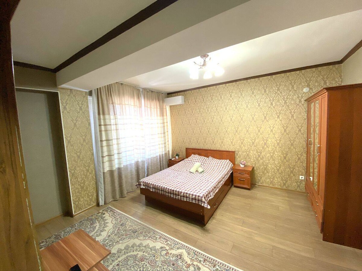 Apartments in the center of the city in a new complex with security ( 24/7). Good view of the city. The apartment has modern furniture, washing machine, dishes. Good internet and tv with english channels. Nearby are many shops, cafes. Large national restaurant Navat. The largest shopping center is Bishkek Park. Near Panfilov Park, Ala-Too Square, Erkindik Park.Our driver can meet you at the airport.