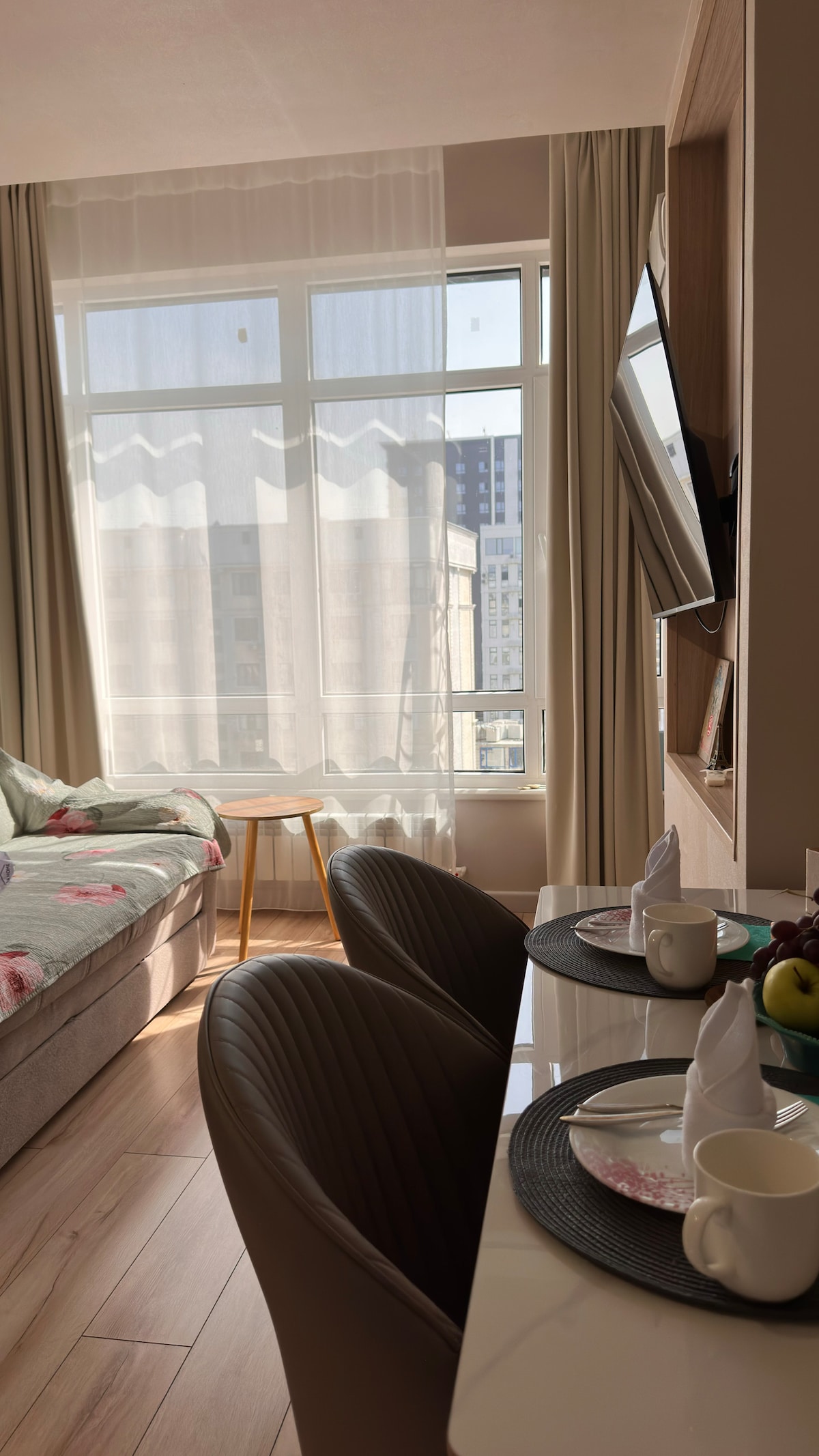 Die Studiowohnung befindet sich auf den letzten Etagen eines komplett neuen Gebäudes, das Gästen einen atemberaubenden Blick auf die Stadt und die schönen Berge bietet. Die Lage der Wohnung ist eine der sichersten in der Stadt, und das Haus selbst wird rund um die Uhr vom Sicherheitsdienst bewacht. Alles ist komfortabel für einen Aufenthalt. Es ist perfekt für zwei Personen. Es gibt auch spezielle Preisangebote für eine Woche und für einen Monat.
