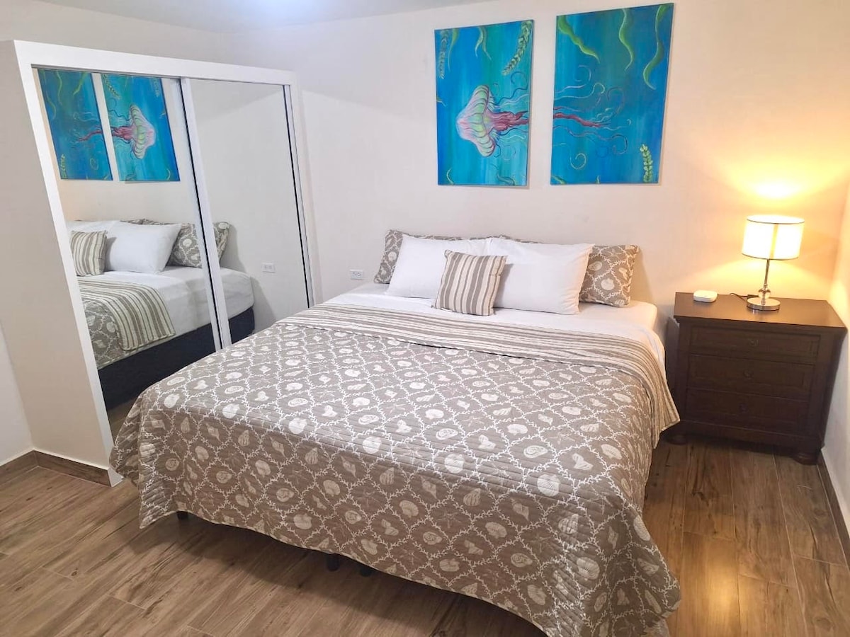 Genieße Komfort und Privatsphäre in dieser geräumigen, modernen Wohnung in einer ruhigen, sicheren Gemeinde in der Nähe von Stränden, Restaurants und Nachtleben. Perfekt für Geschäftsreisende oder Paare. Die Unterkunft verfügt über ein Queensize-Bett, einen gemütlichen Wohnbereich mit Smart-TV, schnelles WLAN, eine voll ausgestattete Küche, ein großes Badezimmer mit Massagedusche, heißes Wasser und einen privaten Balkon. Die Gäste haben auch Zugang zu einem Swimmingpool und einem Whirlpool, ideal zum Entspannen nach der Arbeit oder nach einem Tag unterwegs. Wir freuen uns darauf, Ihnen zu helfen, Ihren Besuch unvergesslich zu machen.