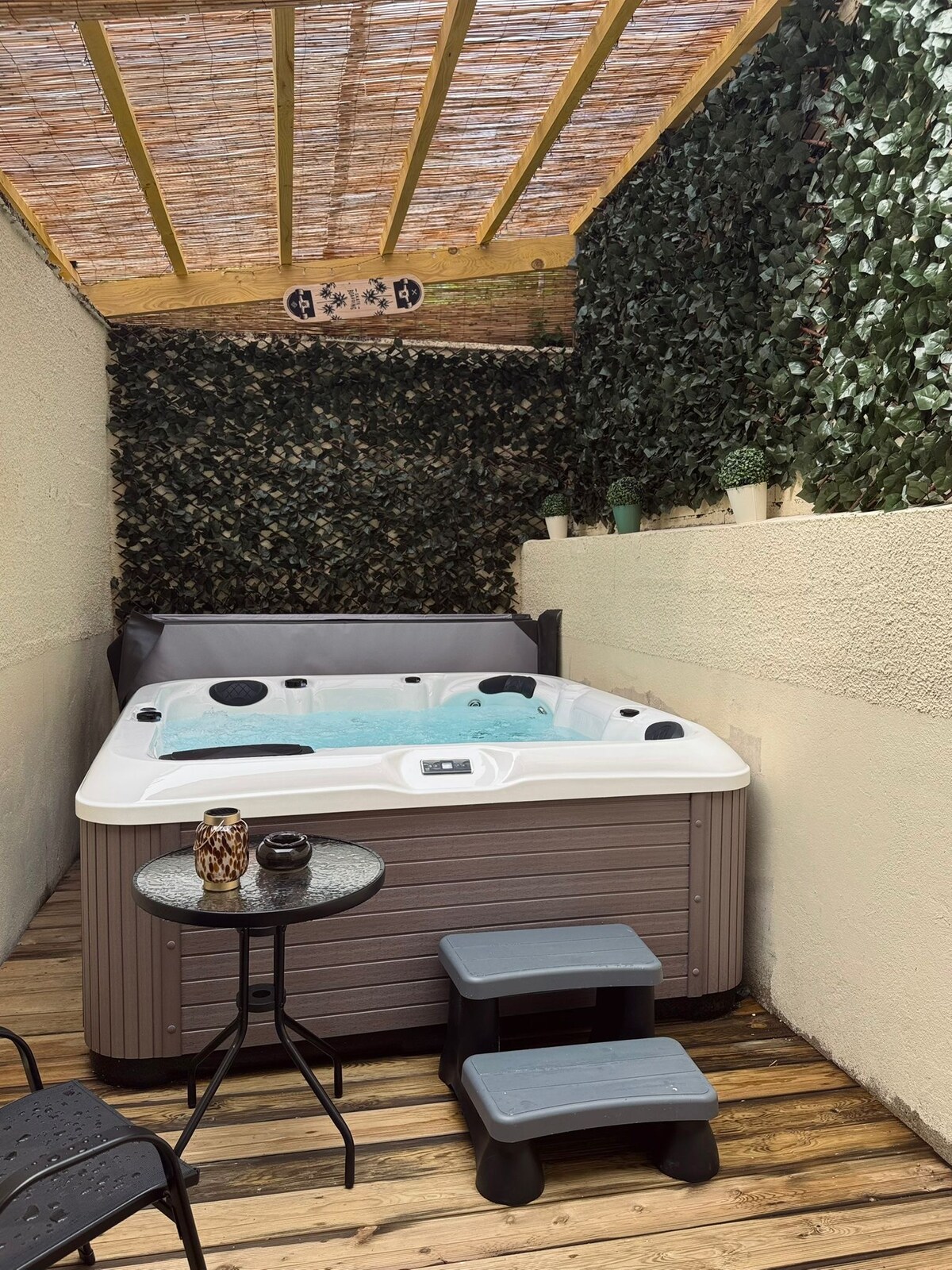 Si vous souhaitez vous détendre, vous reposer et faire une pause bien être, alors venez découvrir l Évasion en Ardennes !!! Notre logement est situé à Aiglemont, petit village calme, à 6 kms de Charleville-Mézières Vous pourrez profiter d un logement spacieux et très bien équipé.. En extérieur, vous pourrez disposer d une terrasse couverte et d une à ciel ouvert disposant d un jacuzzi privatif 5 places .. Venez bénéficier des bienfaits de ses massages… Et de notre nouvel espace sauna…