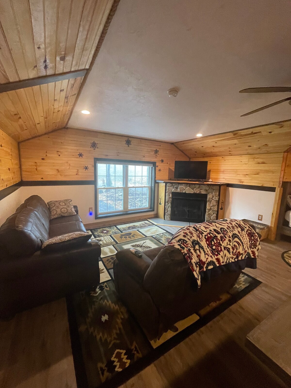Das Hauptschlafzimmer verfügt über ein Queensize-Bett, während das zweite Schlafzimmer ein Doppelbett enthält. Der Wohnbereich ist mit einem Schlafsofa für zusätzlichen Schlafplatz ausgestattet, und das Loft bietet zwei Einzelmatratzen für zusätzliche Unterkünfte, ideal für Kinder. Die Küche der Hütte ist mit allem ausgestattet, was du benötigst, einschließlich Backofen, Kühlschrank und Mikrowelle. Egal, ob du die Zeit drinnen genießt oder die Natur erkundest, diese Hütte bietet die perfekte Balance aus Komfort und Abenteuer.