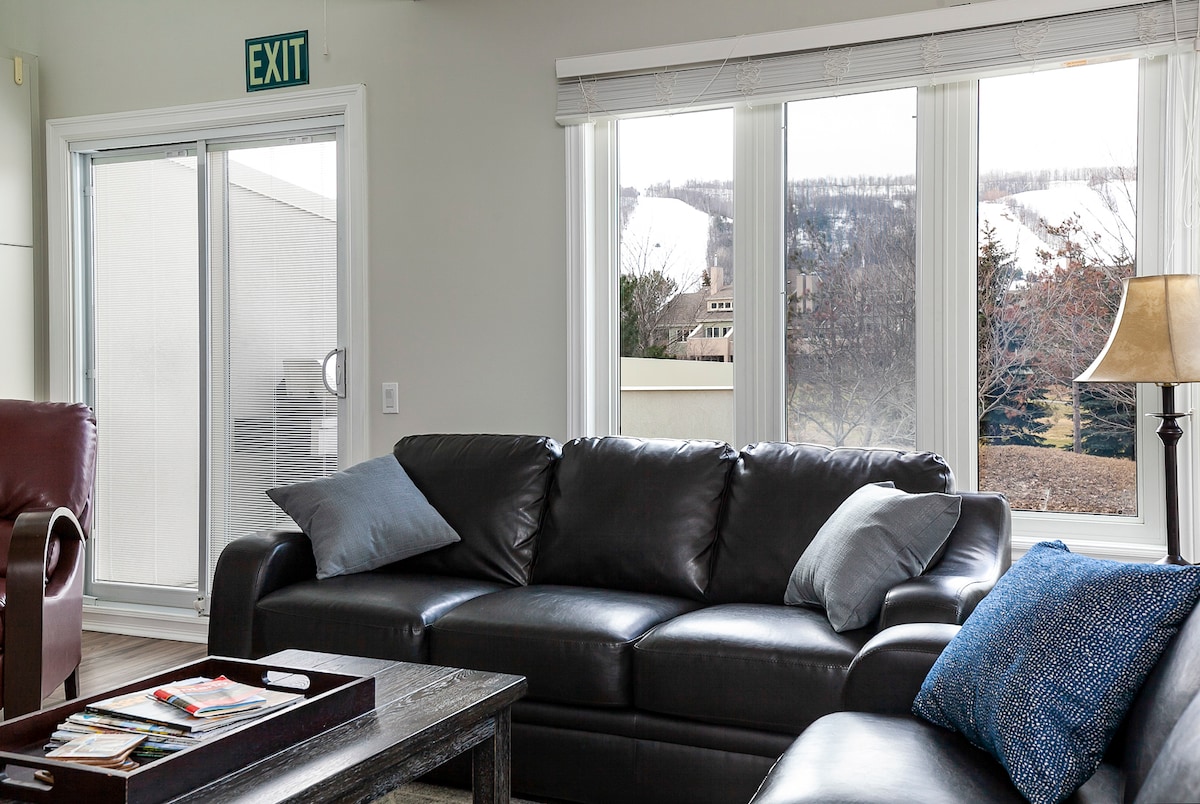 SHUTTLE, HOT TUB, SEASONAL POOL 5-7 minute walk to the Blue Mountain Village. This cozy 2 bedroom condo gives you immediate access to the action or a quiet place to relax by the fireplace while looking out at the mountain views. ★ ★ SMART TVs in living room (WIFI and Cable) and bedrooms (WIFI) ★ Family Ready! Games, booster seat, packnplay etc ★ Resort hot tub with indoor changeroom and washrooms Pool closed for the season