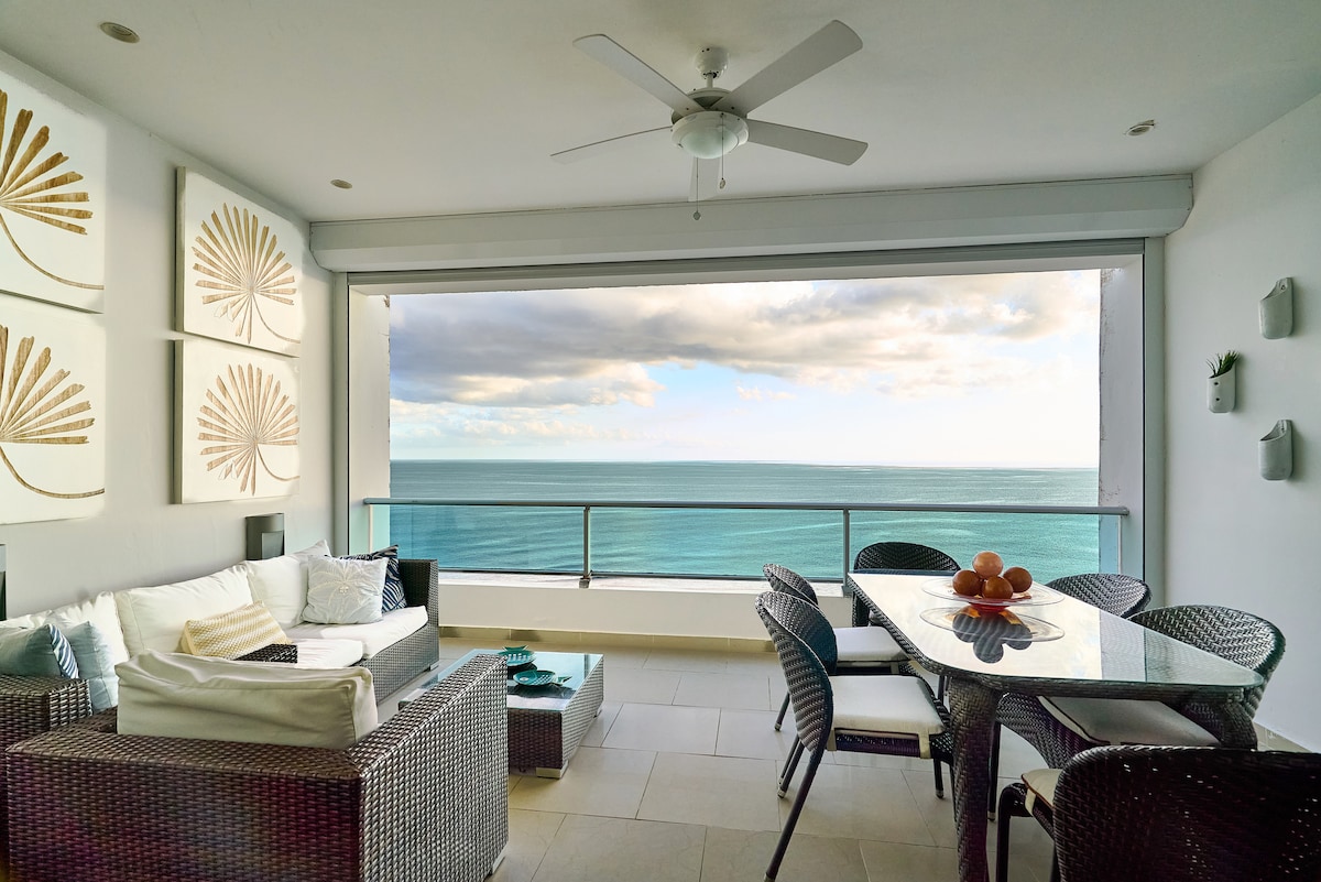 Willkommen in unserer atemberaubenden, voll ausgestatteten Unterkunft mit 3 Schlafzimmern/3 Badezimmern direkt am Strand! Diese exquisite Unterkunft liegt in der obersten Etage und bietet einen unvergleichlichen Panoramablick auf den Ozean, der von jedem Zimmer aus einfach atemberaubend ist. Deine private Terrasse ist der perfekte Aussichtspunkt, um die Sonne zu genießen und die faszinierenden Sehenswürdigkeiten und Klänge des Ozeans zu genießen. Genieße alle Annehmlichkeiten, die der Marbella Towers-Komplex bietet, darunter zwei gigantische Swimmingpools, Sonnenliegen und ein Full-Service-Restaurant.