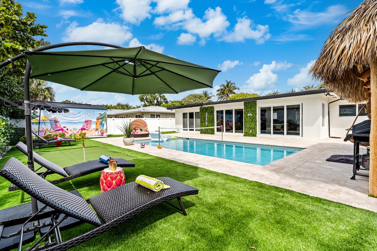 Fully renovated 3 bedroom lake front home in a peaceful neighborhood in West Boca Raton. Luxurious backyard fun for all ages! Large outdoor living area under tiki hut, private golf putting green, mess free turf and clean concrete patio perfect for fishing, sunbathing and cooking. Fully equipped kitchen , full size arcade games, ps5, 60” smart tvs in every room and outside! Message us directly for monthly+ stays/additional questions.