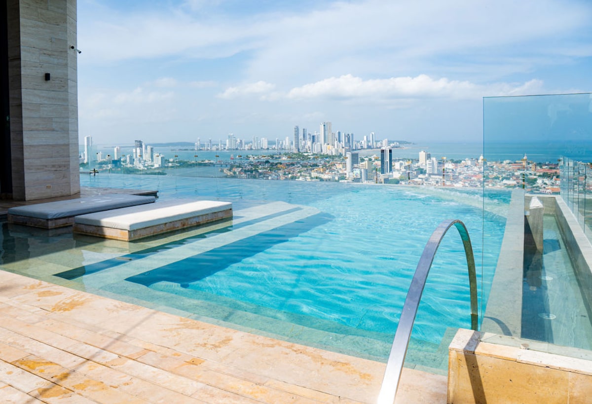 Mach dich bereit für Ruhe! Diese Eigentumswohnung im 39. Stock am Meer ist nagelneu und bietet einen Panoramablick auf die Karibik und die ummauerte Altstadt. In einem Luxusgebäude im Zentrum von Bocagrande gelegen, genießen die Gäste eine Lage in der Nähe des historischen Cartegena und der nahe gelegenen Sehenswürdigkeiten. Genieße die Annehmlichkeiten eines Fünf-Sterne-Resorts, darunter ein atemberaubender Pool am Meer, erstklassige Fitnesseinrichtungen und einen 24-Stunden-Sicherheitsdienst vor Ort.
