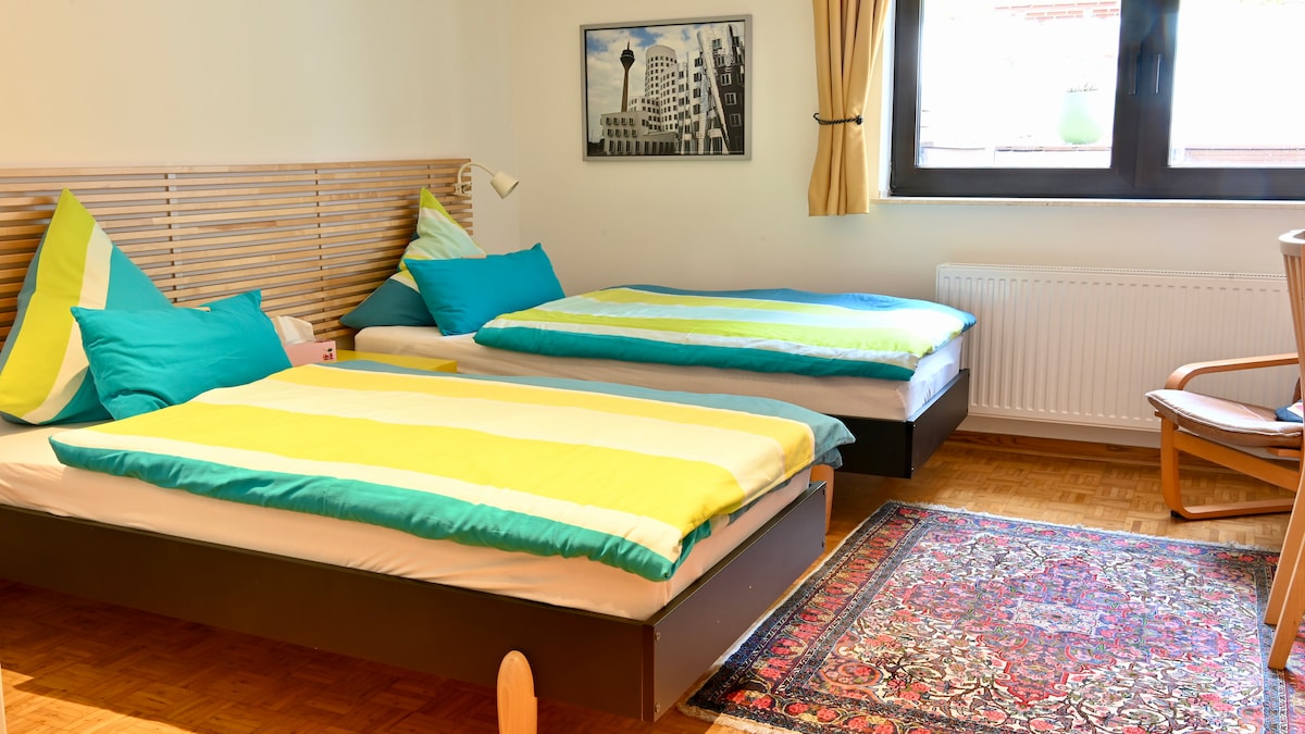 Kleine ruhig gelegene Wohnung (für 1 Gast) mit moderner Einrichtung, direkt an der Messe Düsseldorf sowie dem Nordpark gelegen. Die Bahnhaltestelle mit direkter Anbindung an die Innenstadt liegt von der Wohnung aus knapp 5-8min (Fußweg) entfernt und bringt Sie direkt in die Stadtmitte (10min Fahrt). Ebenfalls in direkter Reichweite Restaurants sowie Bäcker und ein Supermarkt. Frühstück (individuell nach Absprache) im Tagespreis inklusive.