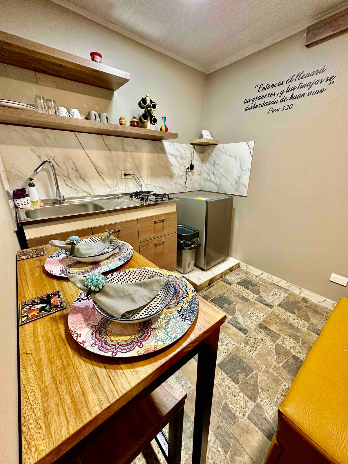 Dieses gemütliche Apartaestudio ist für die exklusive, unabhängige und private Nutzung, bestehend aus einem geräumigen Zimmer mit einem Doppelbett, einem TV, einem Kleiderschrank und einem Schreibtisch, einem Badezimmer mit heißem Wasser und einer Küchenzeile mit Kühlschrank, die alles bietet, was du zum Kochen benötigst, wie Töpfe, Geschirr, Besteck und andere zusätzliche. Das Apartaestudio befindet sich im hinteren Teil des Haupthauses, sodass der Eingang zwischen den beiden geteilt wird. Die Wohnung ist gut beleuchtet, sehr sauber und gemütlich