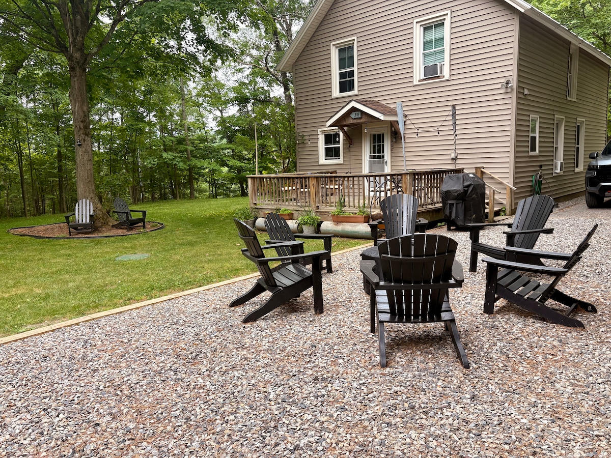 Come visit our year-round mountainside retreat and take it easy at this unique, secluded, tranquil getaway. Located just 3 minutes off I-87 and 8 minutes to town. Gore Mountain is only a 32-minute drive! Enjoy your morning coffee on our inviting front porch, a 1 mile hike to the top of Thomas Mountain, BBQ and dine on the back deck or in our fully-equipped kitchen, roast marshmallows on either of our 2 fire pits, or just relax and enjoy Netflix or AppleTV after a day of Adirondack Adventure.