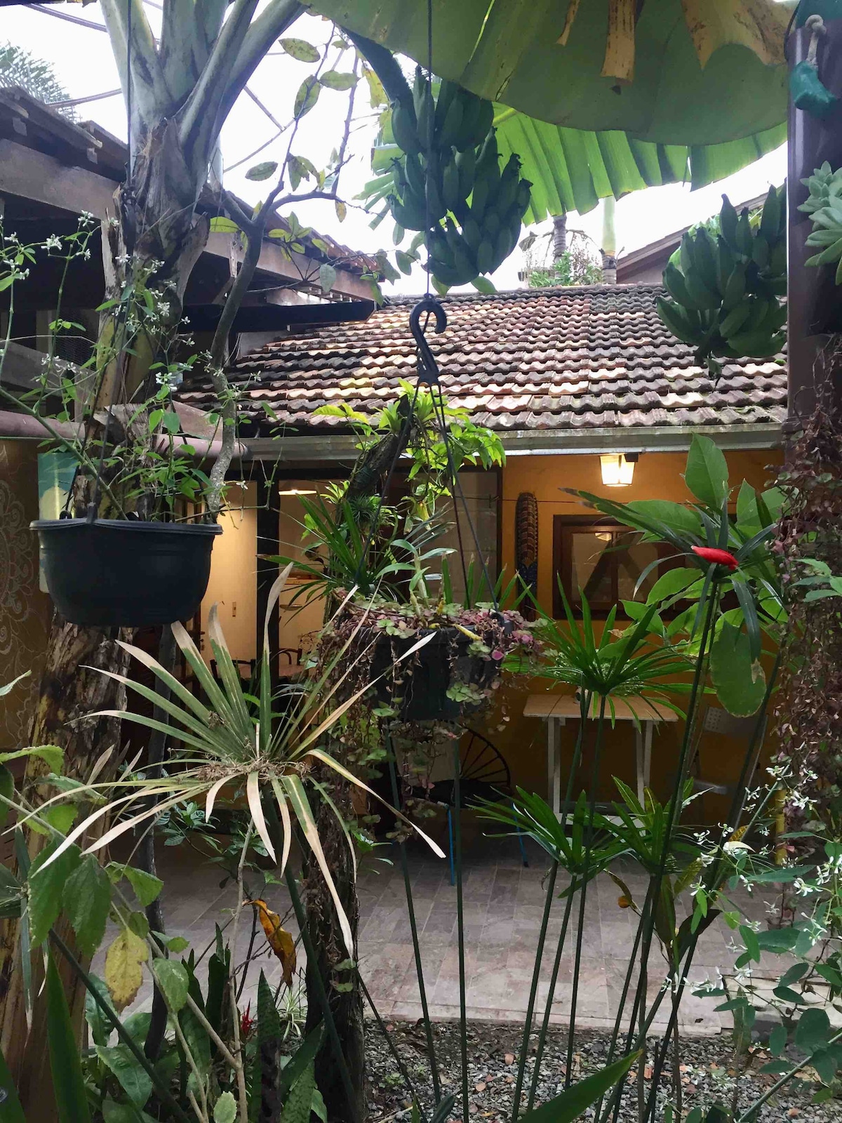 Que tal uma mini casa em meio ao verde para relaxar? A mini casa bananeira, com plantas, arvores e flores que atraem os passarinhos e beija flores, com sorte é possível receber a visita de tucanos e aracuãs. Um espaço para quem gosta de natureza ao redor. Entrada privativa, ar condicionado frio, cama de casal, ideal para 3 pessoas . Cozinha equipada com os itens basicos e banheiro privativo. Estacionamento. Bem localizado, proximo de padaria, mercado e farmácia.
