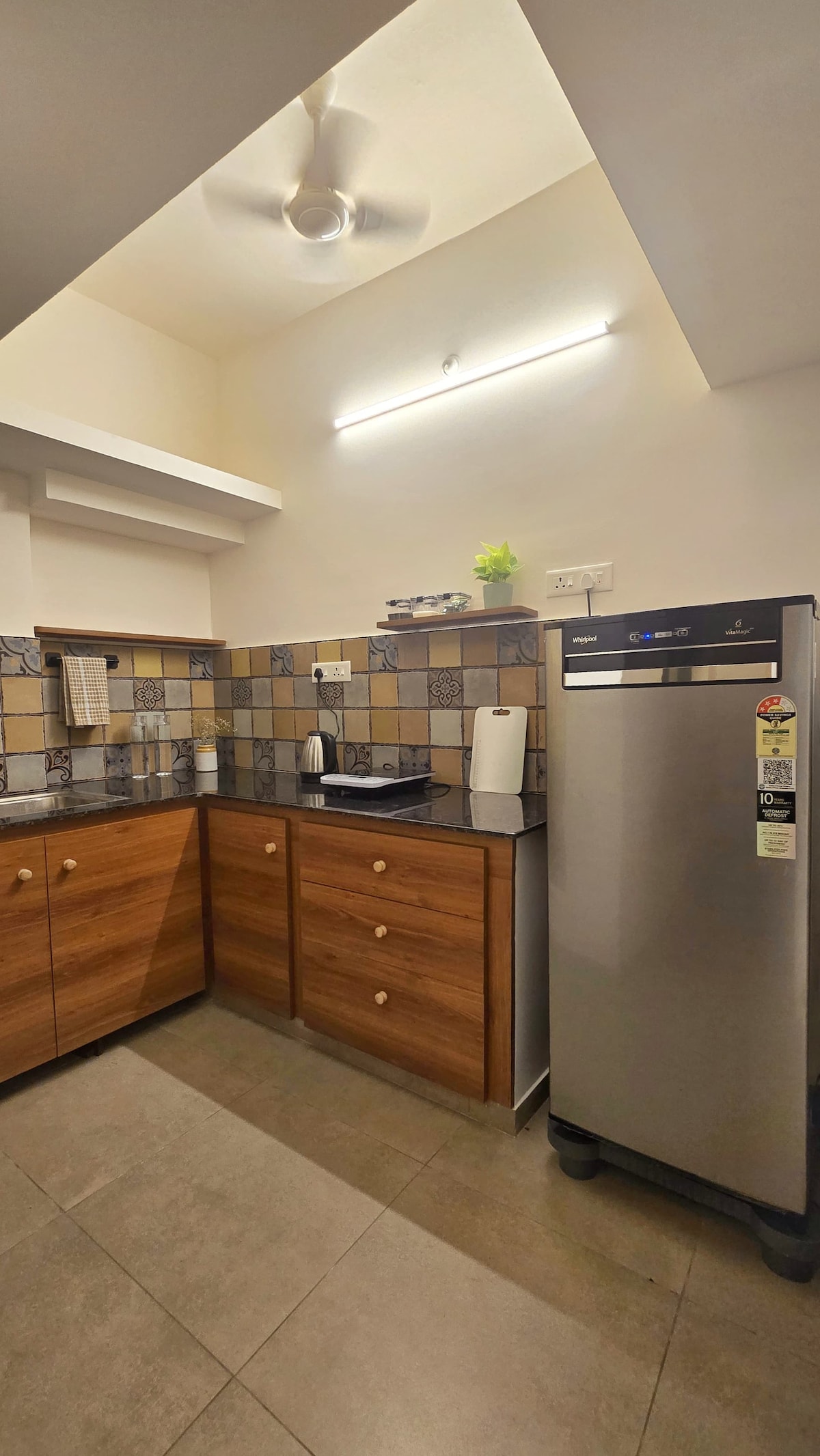 Abhyudaya Studio The studio Abhyudaya is located above a residential home in Aroma Garden locality on Auroville Road. It is situated on the first floor. Auroville Visitors Centre– 3 km away. For 2–3 guests Bathroom has geyser Kitchenette is made for basic cooking. Elaborate meals-not possible. Equipped with: Microwave, Mini Fridge, Water Kettle, Induction Plate. Inverter backup supports fans and lights (AC, geyser, and kitchen appliances will not work). ID at check in required no locals.