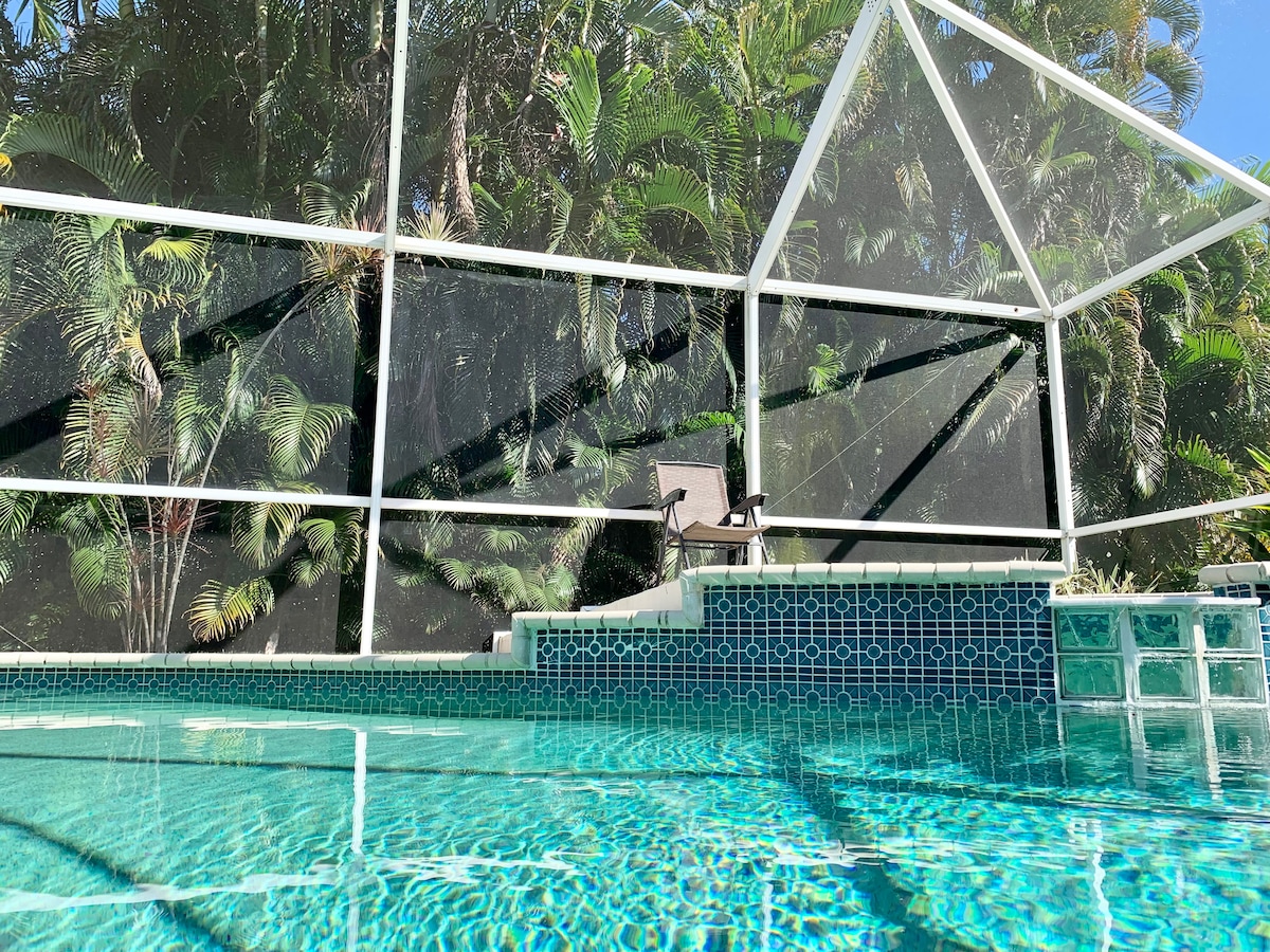 Entspanne dich am solarbeheizten Pool und genieße die Ruhe des schönen und friedlichen 0,6 Hektar großen Grundstücks mit einem natürlichen Teich, wo verschiedene Vogelarten wie Reiher und Enten zu sehen sind. In der Nähe von Einkaufsmöglichkeiten, Restaurants und nur 7,5 Meilen vom Bonita Beach Park entfernt. Wenn du Golf spielst, ist der Bonita Fairways Public Golf Club 2,8 Meilen entfernt. Oder kaufe einen Tagespass im Hyatt Regency und verbringe den Tag am Lazy River und den Wasserrutschen. Der Garten ist komplett eingezäunt, ideal, um deinen Hund laufen zu lassen.