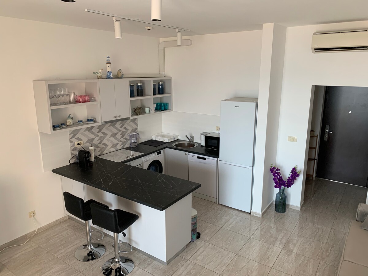 Schöne, moderne und komfortable Wohnung, Kategorie Lux-Klasse, gebaut 2022. Sie befindet sich 30 m vom schönen Sandstrand entfernt. 5. Stock des Wohnhauses mit Aufzug. Ruhiger und friedlicher Ort, wo alles in der Nähe ist. Doppel-Dzambo-Bett in Premium-Qualität, 180 cm breit. Bequeme, super orthopädische Matratze. Saubere und frisch gewaschene Bettwäsche. Modernes Design-Badezimmer mit Dusche. Terrasse mit Gartenmöbeln und Blick auf die Berge.