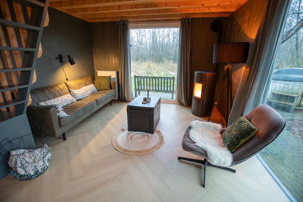 Luka's Hut, our beautiful eco-cabin, sits on the banks of the Ganzendiep river in Overijssel. Huge windows provide stunning Dutch views onto the river, the grass meadows with cows & sheep and a picturesque village in the distance. The river is quiet water so have a sauna & a swim, take out the kayak, big canoe or SUPboard. We have a heatpump for the floor heating, and used upcycled items such a charming wood-stove, a fantastic bath, a fully-equipped kitchen, bikes, a firepit & trampoline.