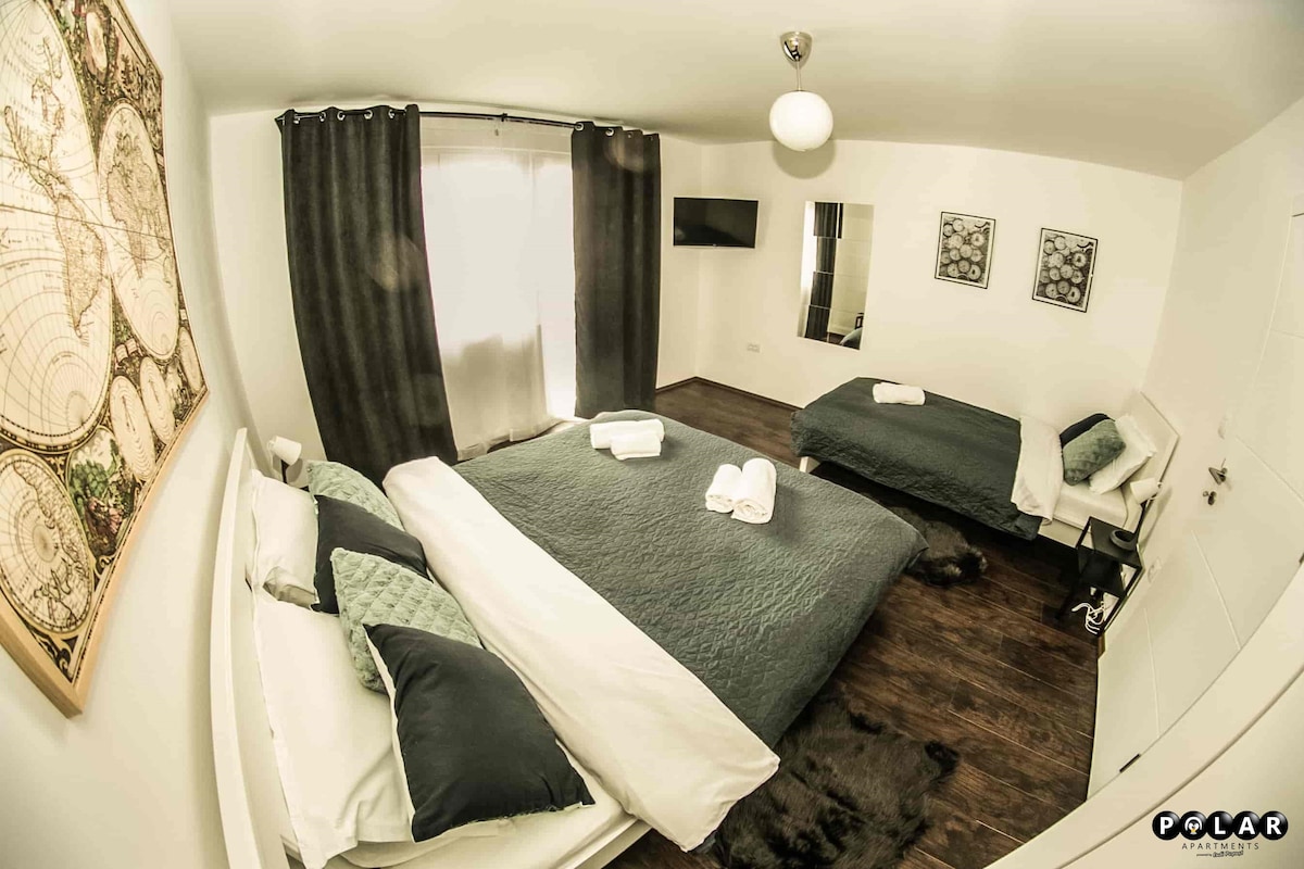 The spacious 85 m² hotel suite offers perfect comfort for families, couples, or friends. It features two cozy bedrooms – one with a large king-size bed for complete relaxation and the other with two separate, comfortable twin beds. The bright living room with a dining area is ideal for relaxing or socializing, while the fully equipped kitchen is ready for any culinary inspiration. Everything is designed to make your stay as pleasant, relaxing, and memorable as possible.
