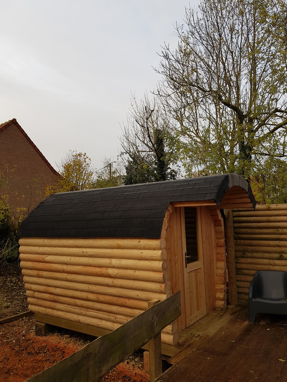 Sie schlafen in einem Blockfass, mit dem Chalet direkt nebenan Verbringen Sie einen ruhigen Aufenthalt zu zweit mit einem kompletten Tapetenwechsel. Sie haben eine kleine Kitchinette mit zwei Gasen, eine Mikrowelle Grill und eine Spüle Möglichkeit, Frühstück und Catering-Gerichte zu bestellen