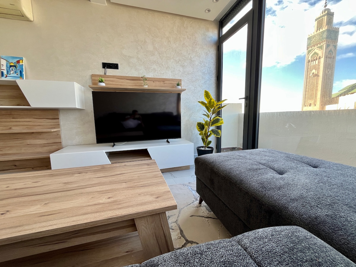 Gemütliche Wohnung direkt am Meer und im Zentrum von Casablanca , gut ausgestattet, Glasfaser ( 100 mb),sonnig mit Klimaanlage/Zentralheizung. In der Nähe der beiden großen Mall der Stadt, Cafés und Restaurants. Die Wohnung befindet sich direkt neben der Hassan-Moschee 2 (5 min zu Fuß) , Park der Arabischen Liga (8 min) , zentraler Markt (11 min ).... Esplanade de la Corniche 1min mit einem magischen Blick auf die Hassan-Moschee 2. In der Nähe von Lebensmittelgeschäften, Cafés, Banken, ...