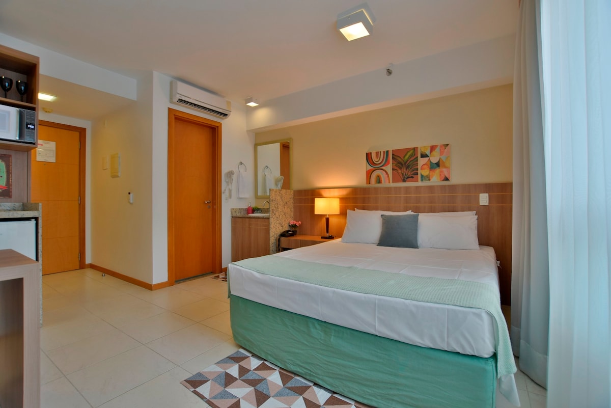 Experiência de hotel completa! Kit completo com roupas de cama, itens de banho e cozinha, limpeza com camareira após cada hóspede, limpeza adicional durante estadia sob demanda do hóspede mediante valor à parte. 1 vaga de garagem, checkin pela recepção. Piscina, academia, sauna, restaurante, bar, conveniência 24h, jacuzzis compartilhadas, lavanderia, decks à beira do lago. Restaurante com bar, almoço e jantar a la carte. Loja de conveniência no lobby com opções de café da manhã.
