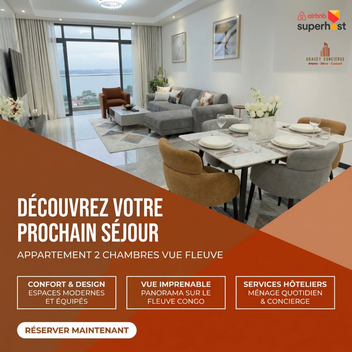 Bienvenu… Élégant et situé à GB Diplomate, aux portes de Gombe, dans un nouveau complexe résidentiel haut standing et ultra sécurisé. Intérieurs raffinés, volumes lumineux et confort haut de gamme pour un séjour sans compromis. Piscine, jacuzzi, salle de sport, espaces extérieurs et piste de course, banques, supermarché et restaurants. Location de véhicule avec chauffeur disponible sur demande. Cleaner disponible 3x par semaine à nos frais. Arrivée anticipé / départ tardif à 15$ / heure