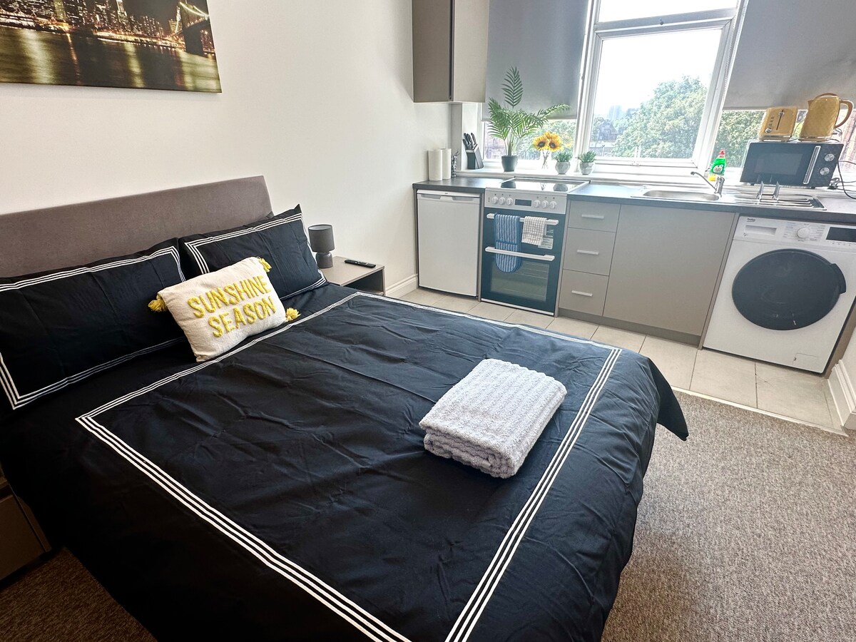 Moderne Studiowohnung im Erdgeschoss mit eigenem Eingang im Herzen von Golders Green. Das neu renovierte Hotel im Hotelstil liegt nur 2 Gehminuten von der U-Bahn-Station Brent Cross entfernt und bietet schnellen Zugang zum Zentrum von London. Mit einem komfortablen Doppelbett, einem eleganten Badezimmer und einer voll ausgestatteten Küche mit Herd, Backofen, Kühlschrank, Wasserkocher und Kochgeschirr. Highspeed-WLAN inklusive – perfekt für kurze Aufenthalte und längere Besuche.